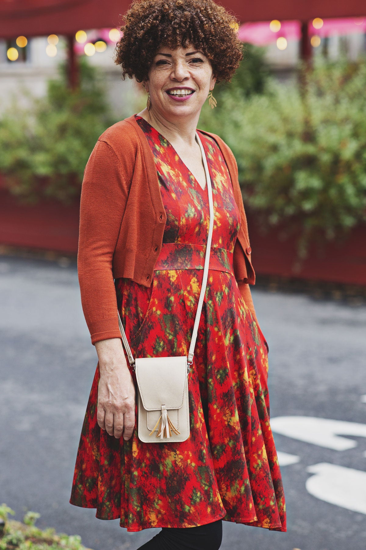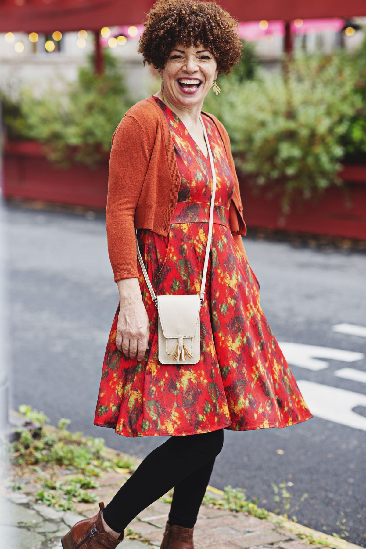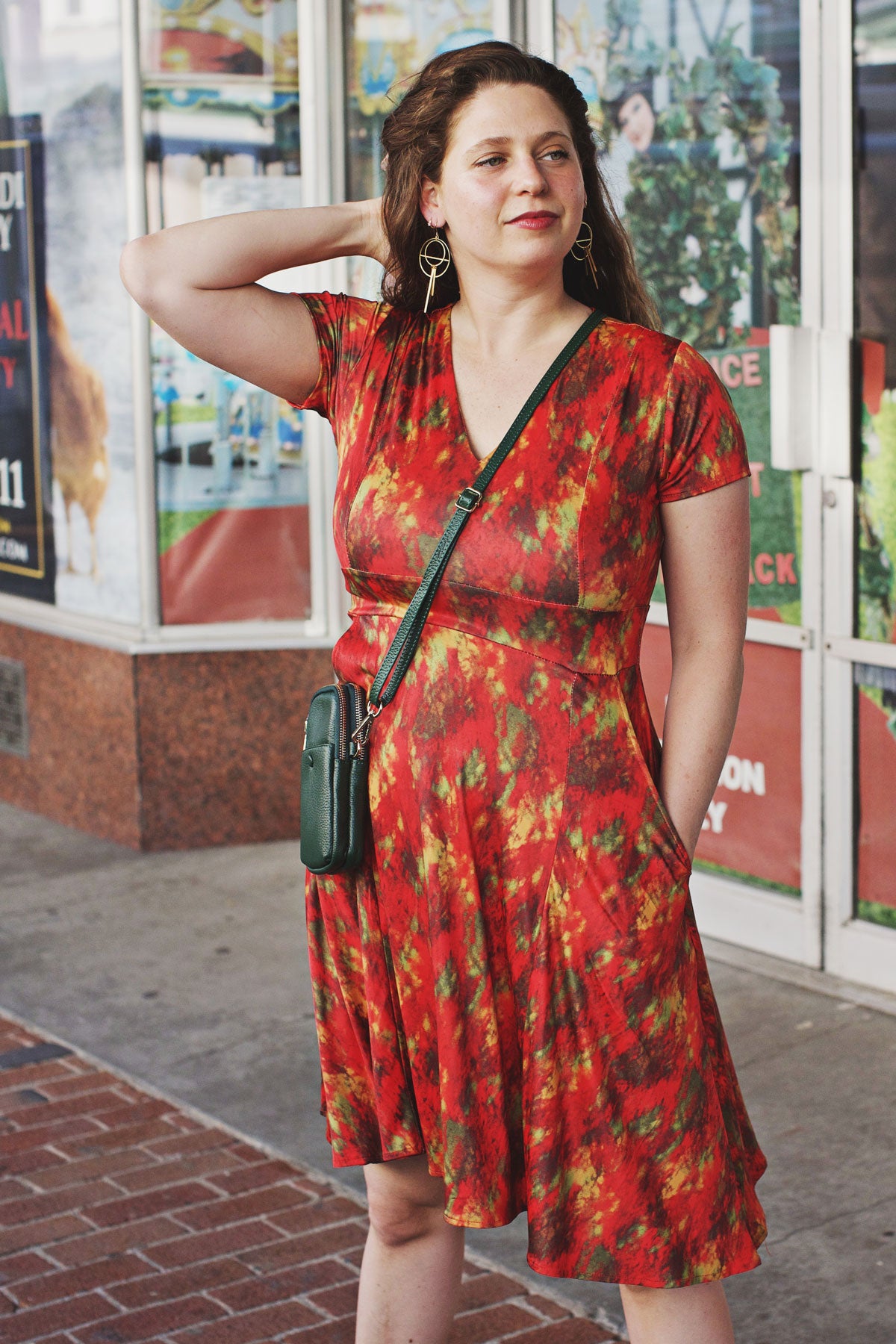 The Cece Dress is the perfect balance of fun and practicality. This best-selling style features shallow V neckline, flattering waistband that falls underneath the bust line, short sleeves and pockets. It features an abstract print in shades of red, orange, mustard, olive and brown that's perfect for autumn. However you style it, it's sure to be your go-to dress. Proudly made in the USA with wrinkle-free, machine-washable fabric (polyester/spandex).