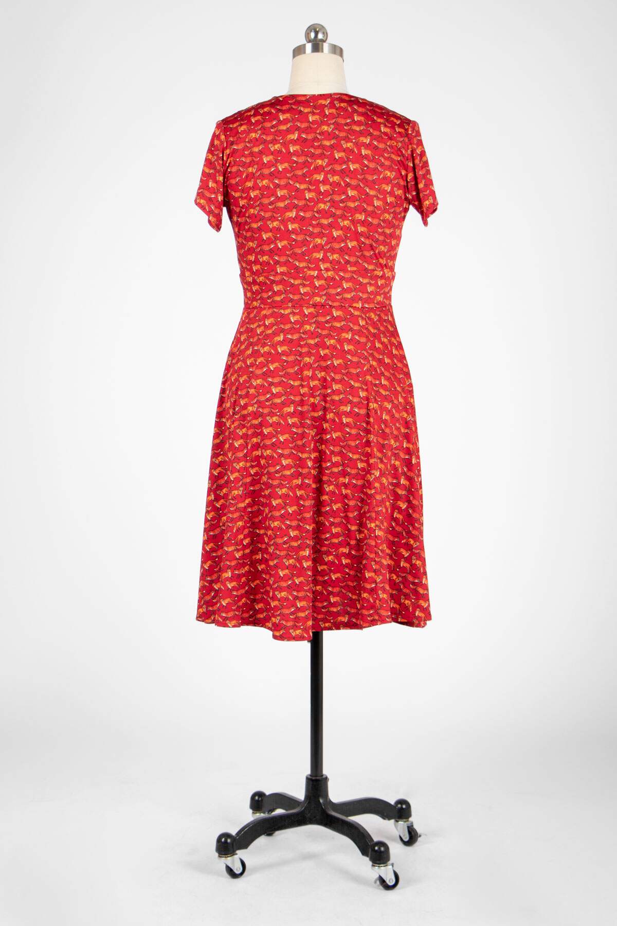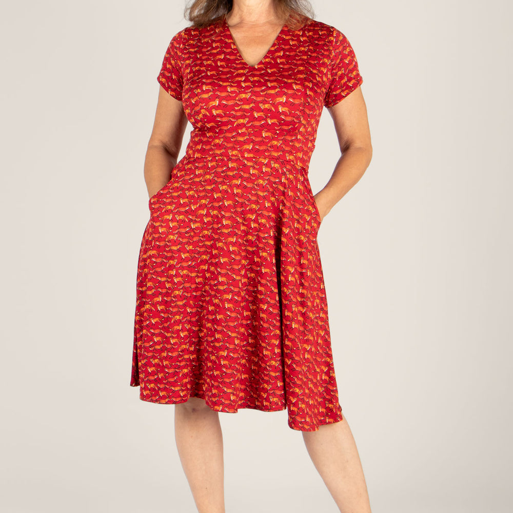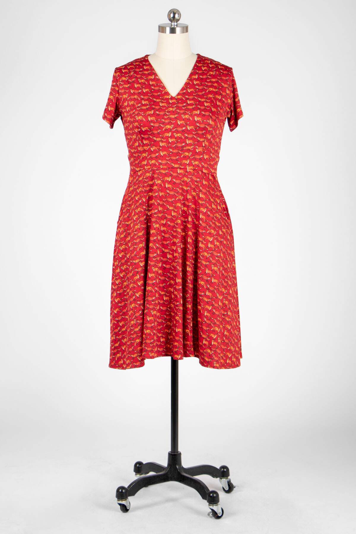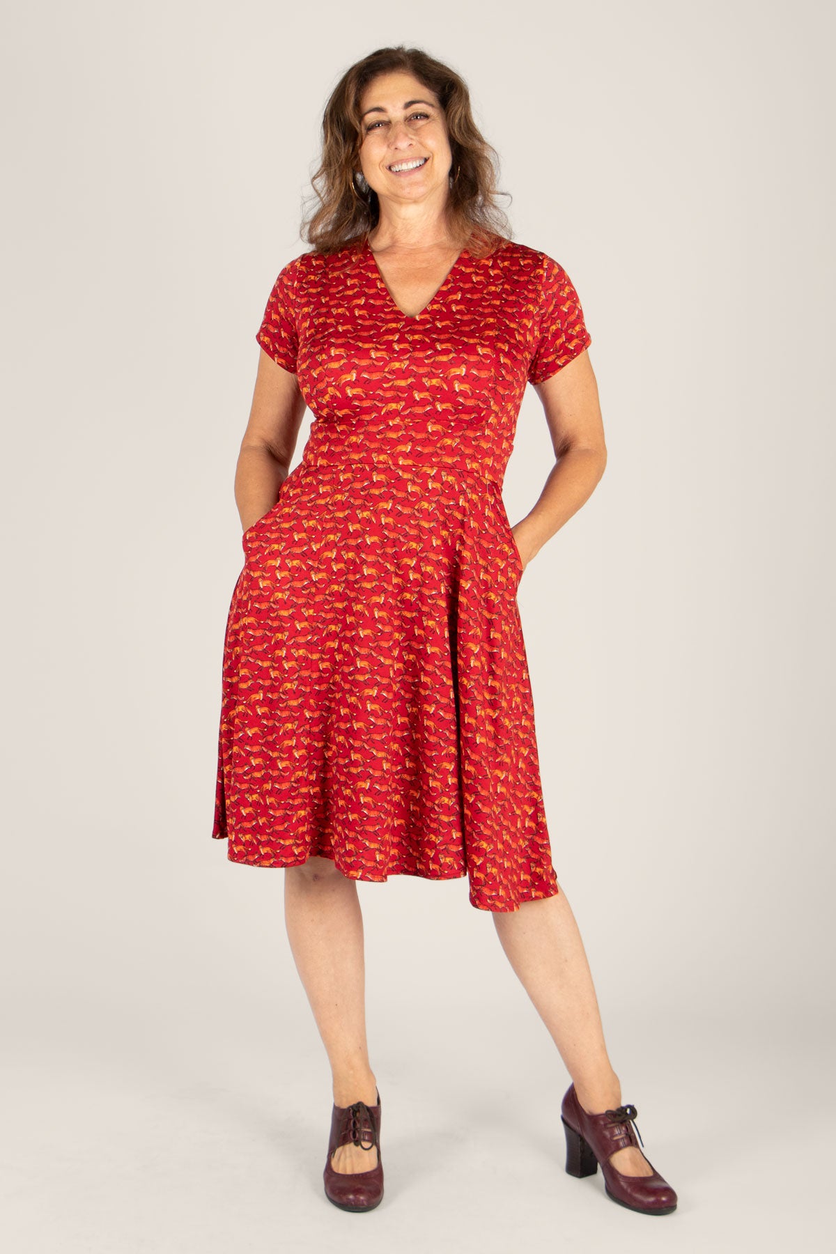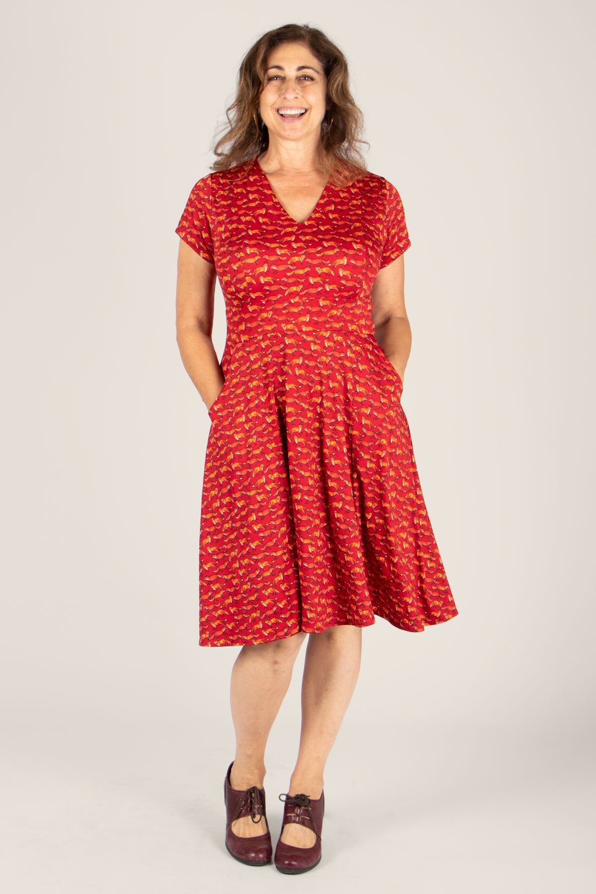 Be foxy and fabulous in our Cece Dress! This show-stopping style and print has it all: a stunning deep red and orange background featuring hand-drawn foxes, a flattering V neckline, princess-seam bodice, short sleeves, a waistband that flatters, and pockets! The six-panel skirt offers a feminine drape and our wrinkle-free fabric (polyester/spandex blend) is machine-washable so you can look stylishly spunky all day long. Plus, it's made in the U.S.A., so you can show your true colors!