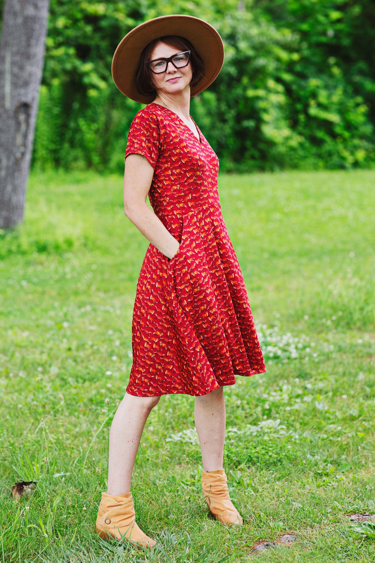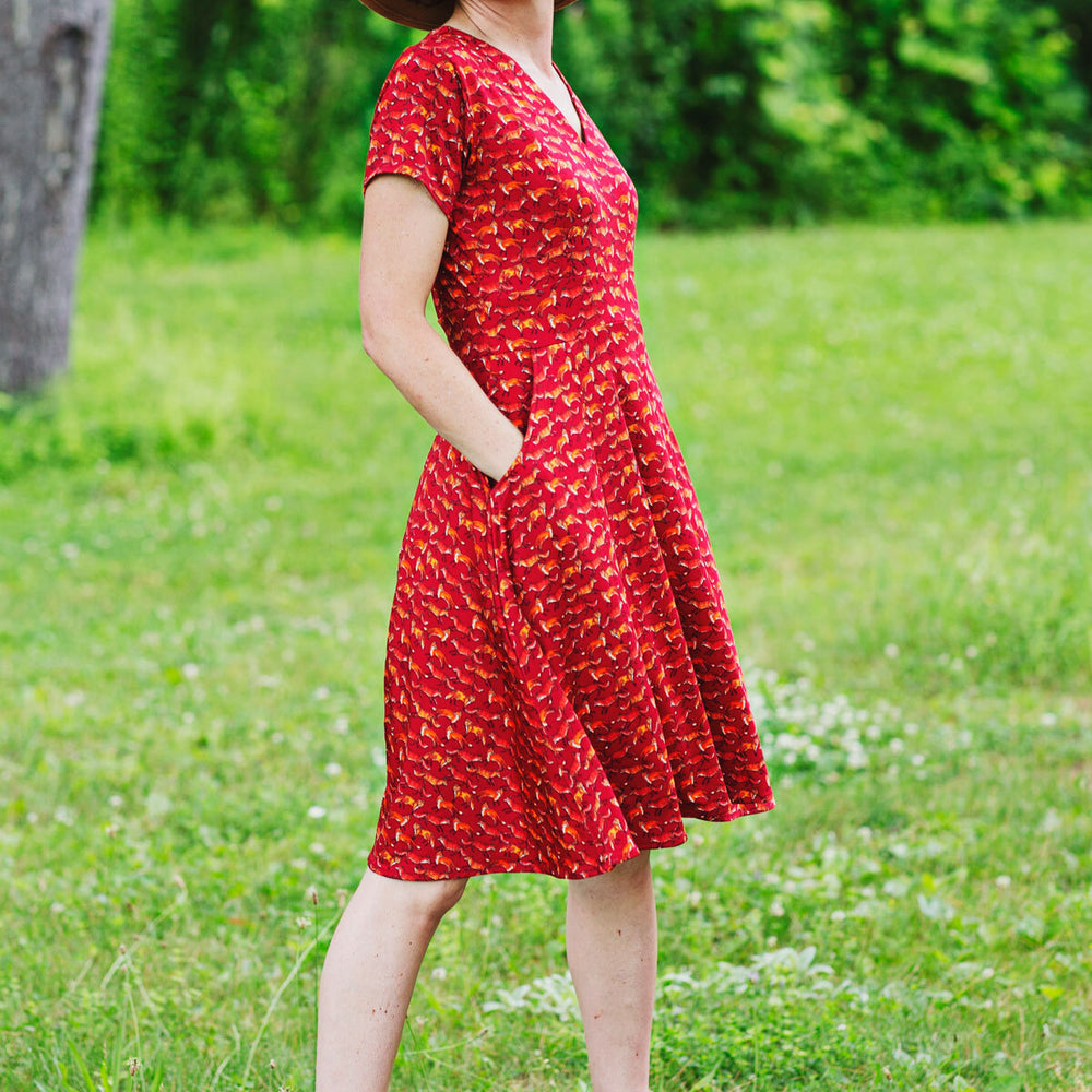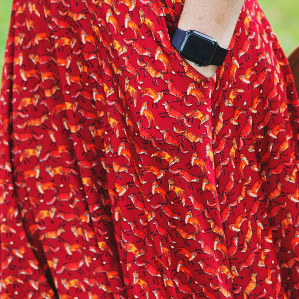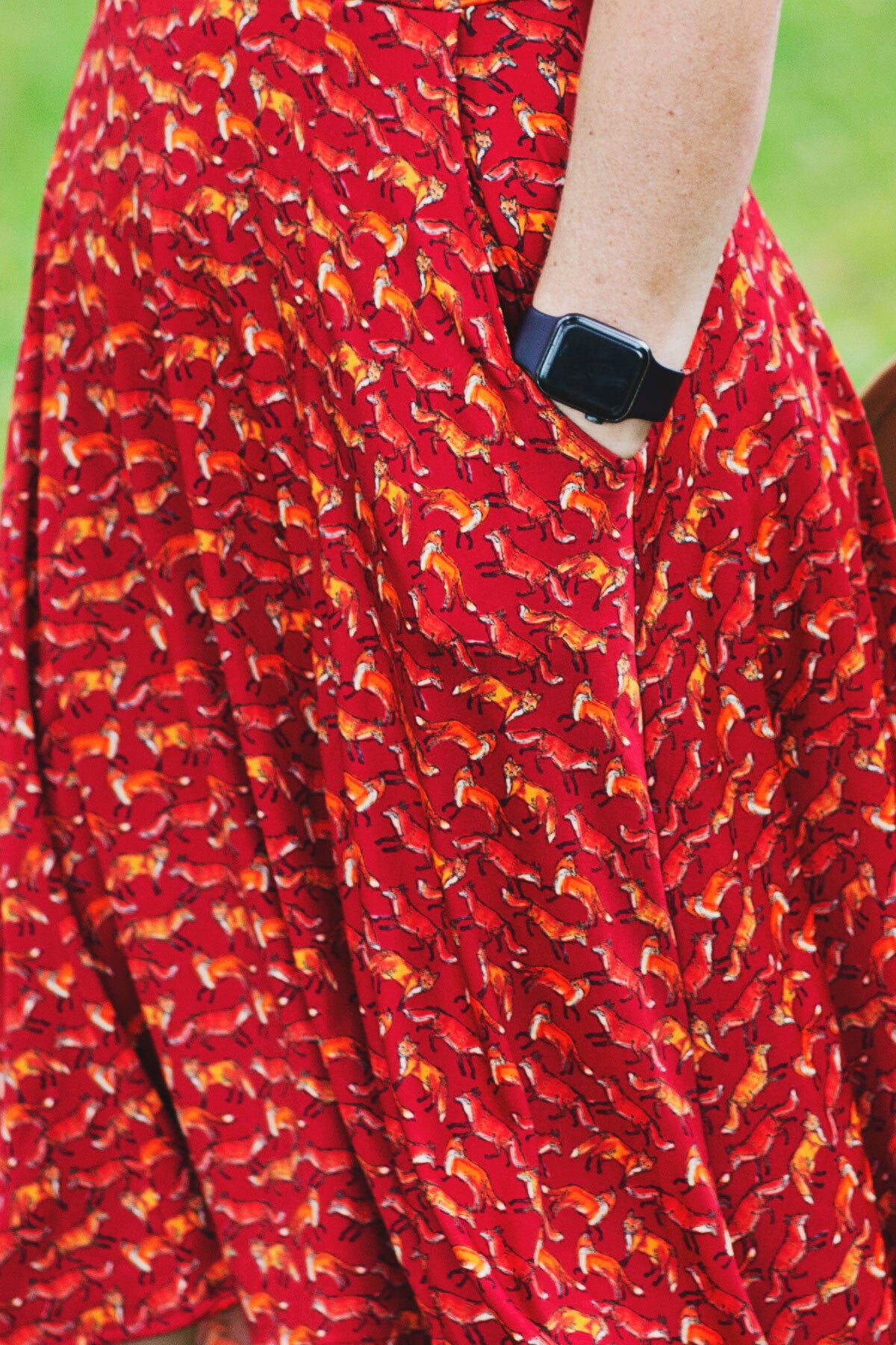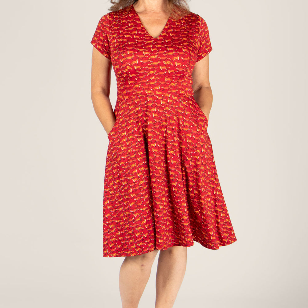 Be foxy and fabulous in our Cece Dress! This show-stopping style and print has it all: a stunning deep red and orange background featuring hand-drawn foxes, a flattering V neckline, princess-seam bodice, short sleeves, a waistband that flatters, and pockets! The six-panel skirt offers a feminine drape and our wrinkle-free fabric (polyester/spandex blend) is machine-washable so you can look stylishly spunky all day long. Plus, it's made in the U.S.A., so you can show your true colors!