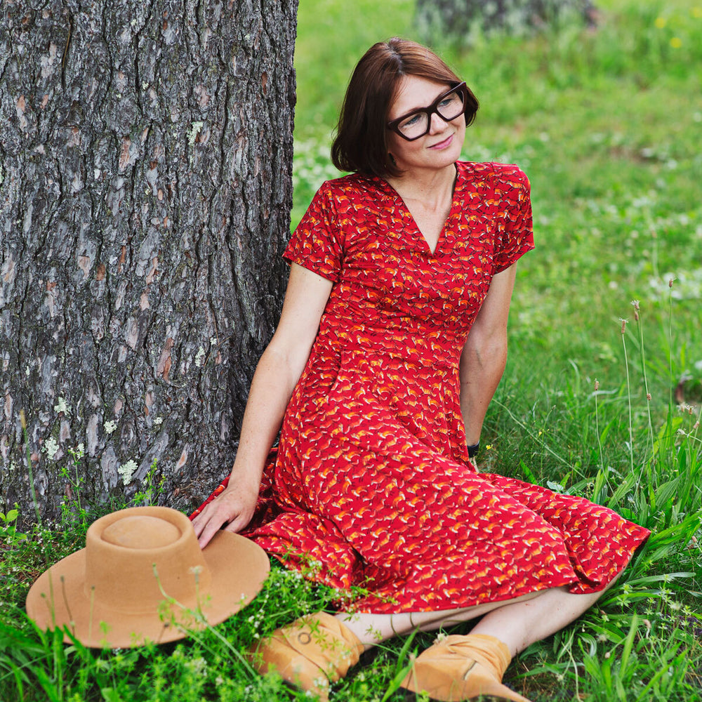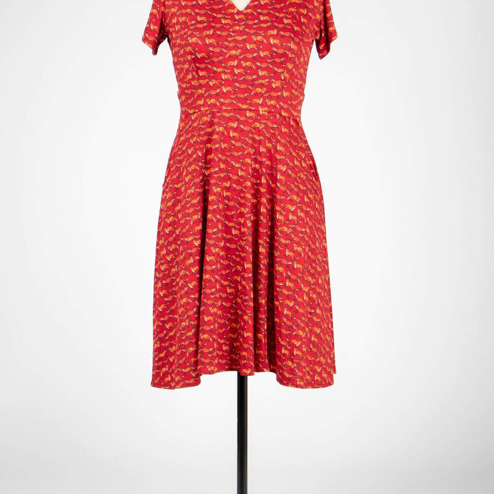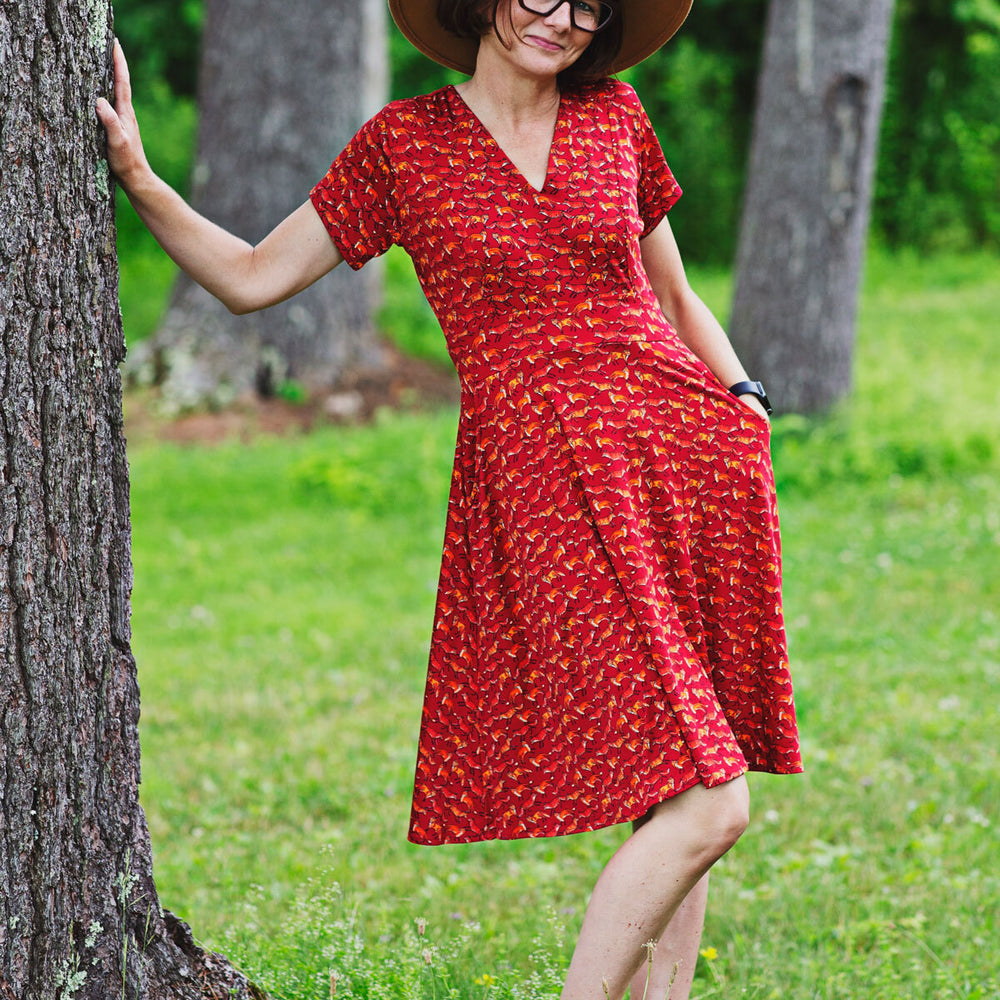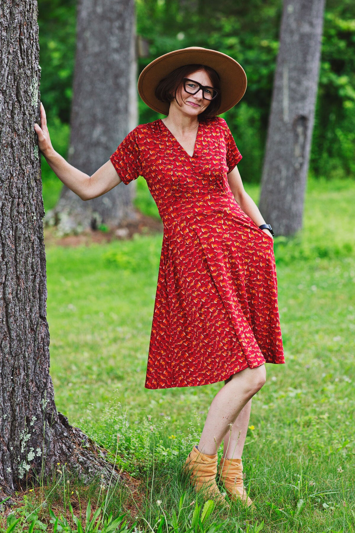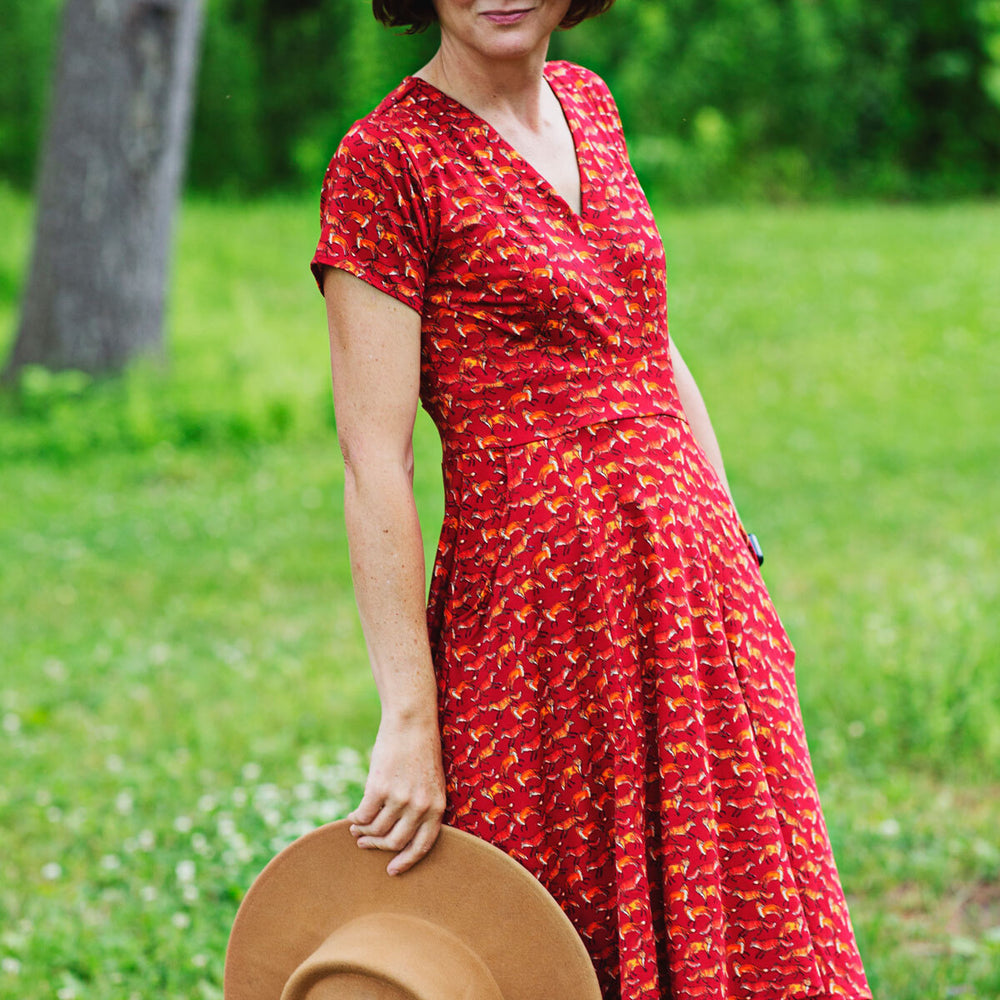 Be foxy and fabulous in our Cece Dress! This show-stopping style and print has it all: a stunning deep red and orange background featuring hand-drawn foxes, a flattering V neckline, princess-seam bodice, short sleeves, a waistband that flatters, and pockets! The six-panel skirt offers a feminine drape and our wrinkle-free fabric (polyester/spandex blend) is machine-washable so you can look stylishly spunky all day long. Plus, it's made in the U.S.A., so you can show your true colors!