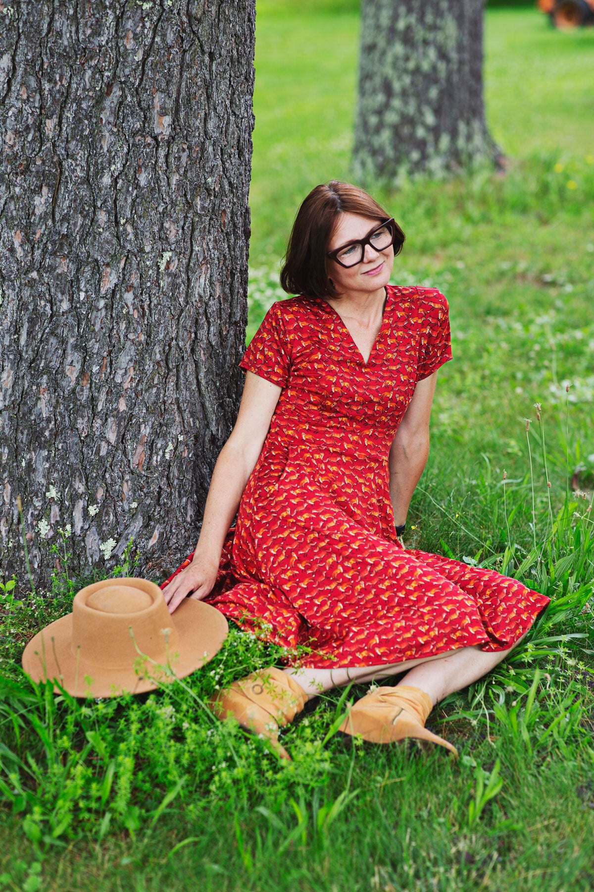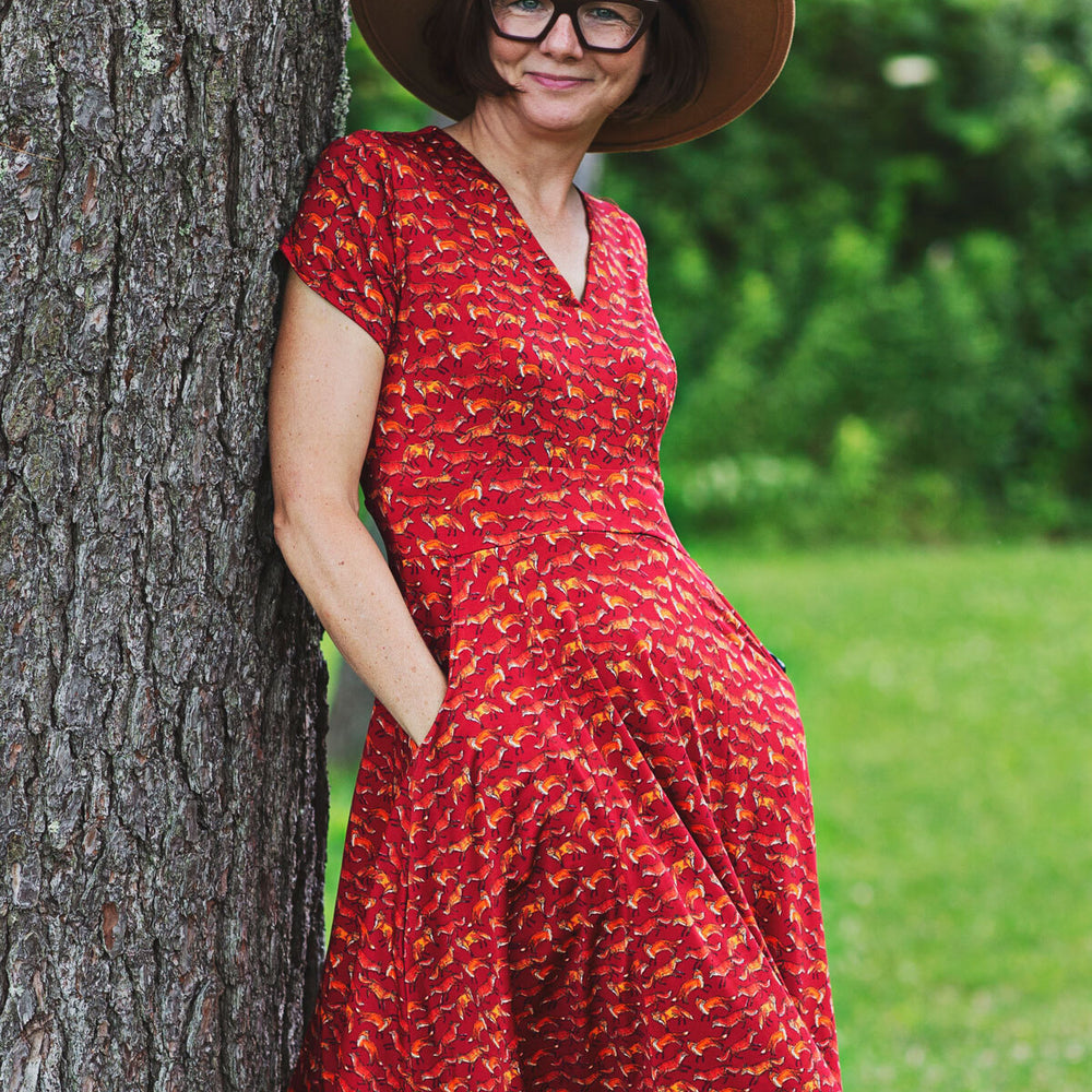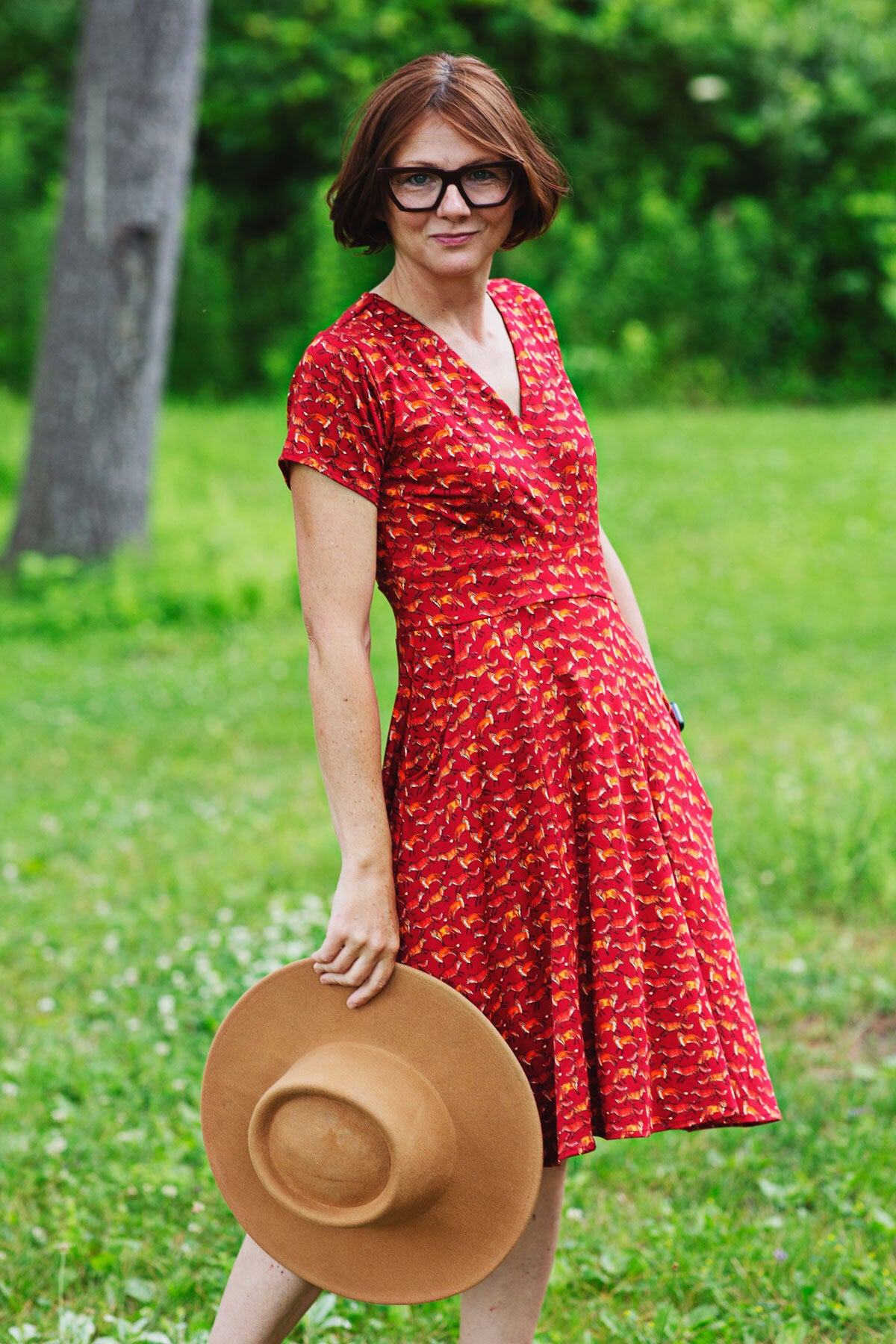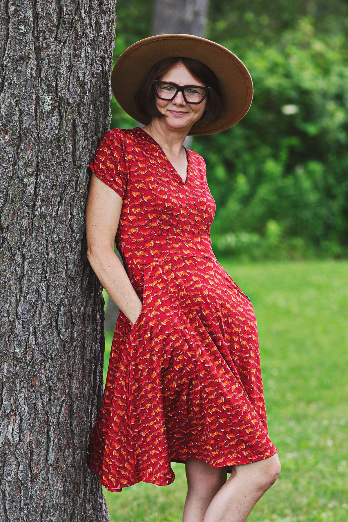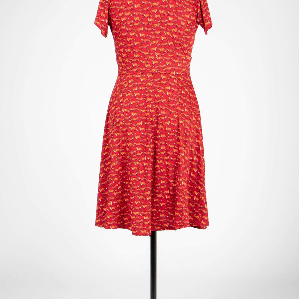 Be foxy and fabulous in our Cece Dress! This show-stopping style and print has it all: a stunning deep red and orange background featuring hand-drawn foxes, a flattering V neckline, princess-seam bodice, short sleeves, a waistband that flatters, and pockets! The six-panel skirt offers a feminine drape and our wrinkle-free fabric (polyester/spandex blend) is machine-washable so you can look stylishly spunky all day long. Plus, it's made in the U.S.A., so you can show your true colors!