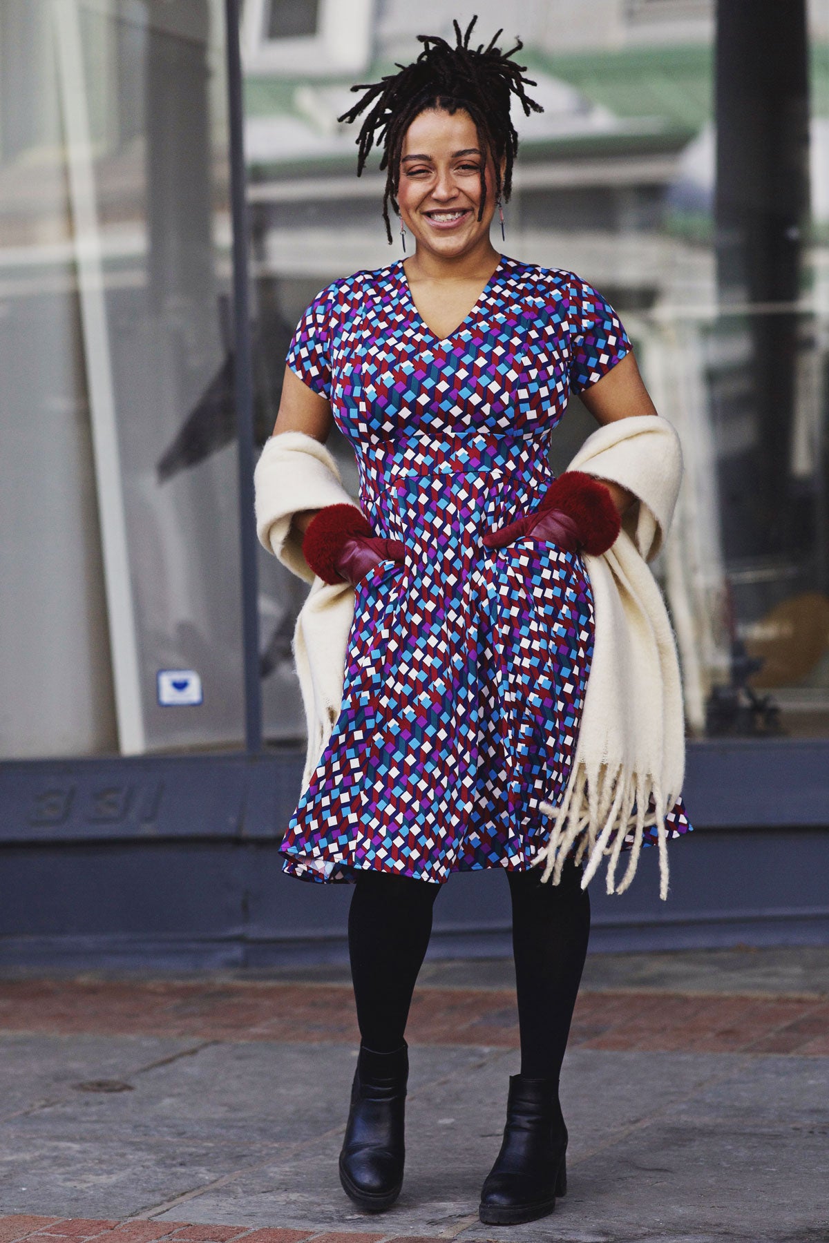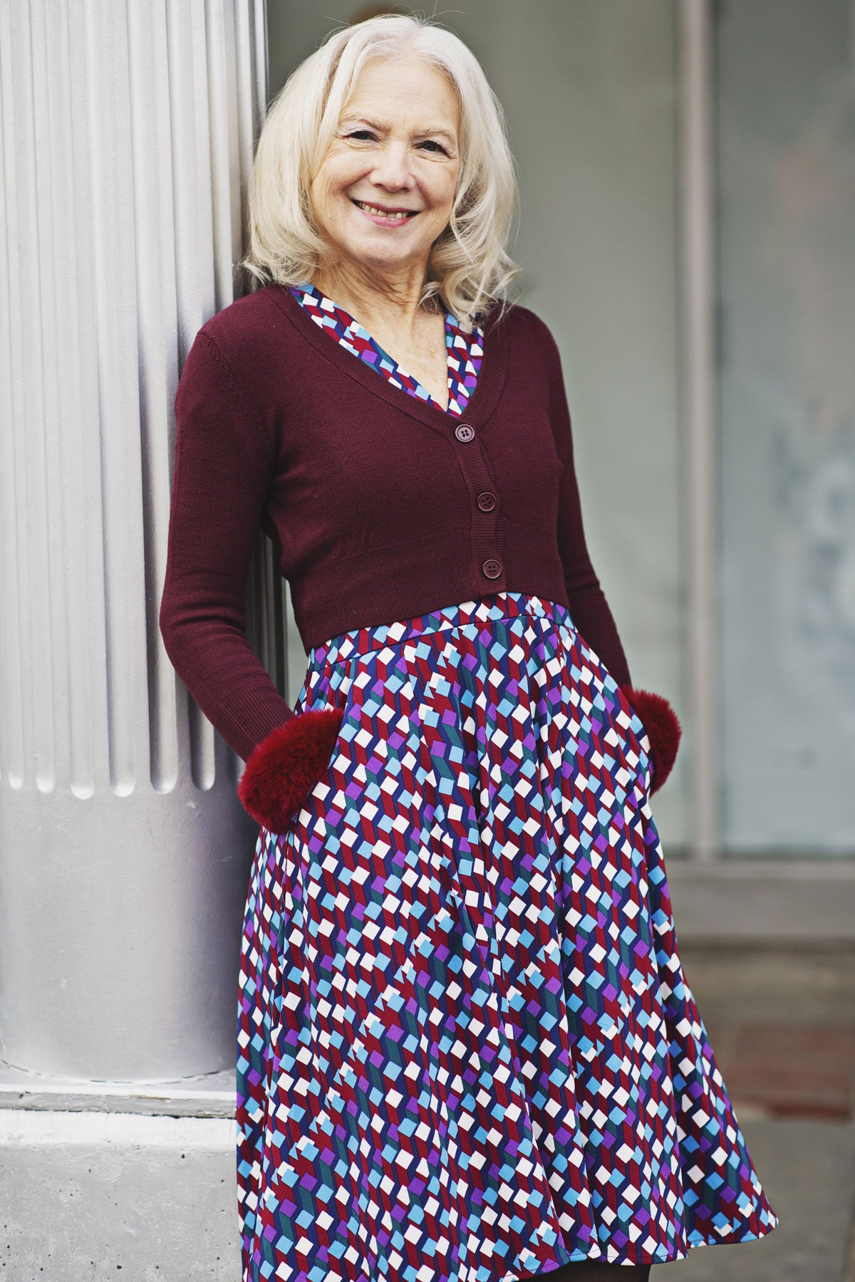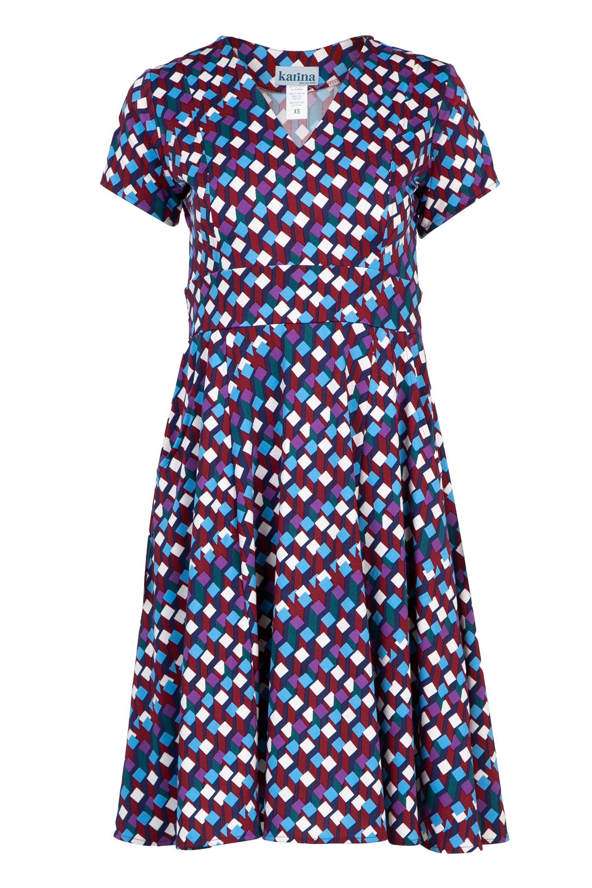 The Cece Dress is the perfect balance of fun and practicality. This best-selling style features shallow V neckline, flattering waistband that falls underneath the bust line, short sleeves and pockets. It features a geometric print with shades of purple, navy, teal, cream and crimson. However you style it, it's sure to be your go-to dress. Proudly made in the USA with wrinkle-free, machine-washable fabric (polyester/spandex).