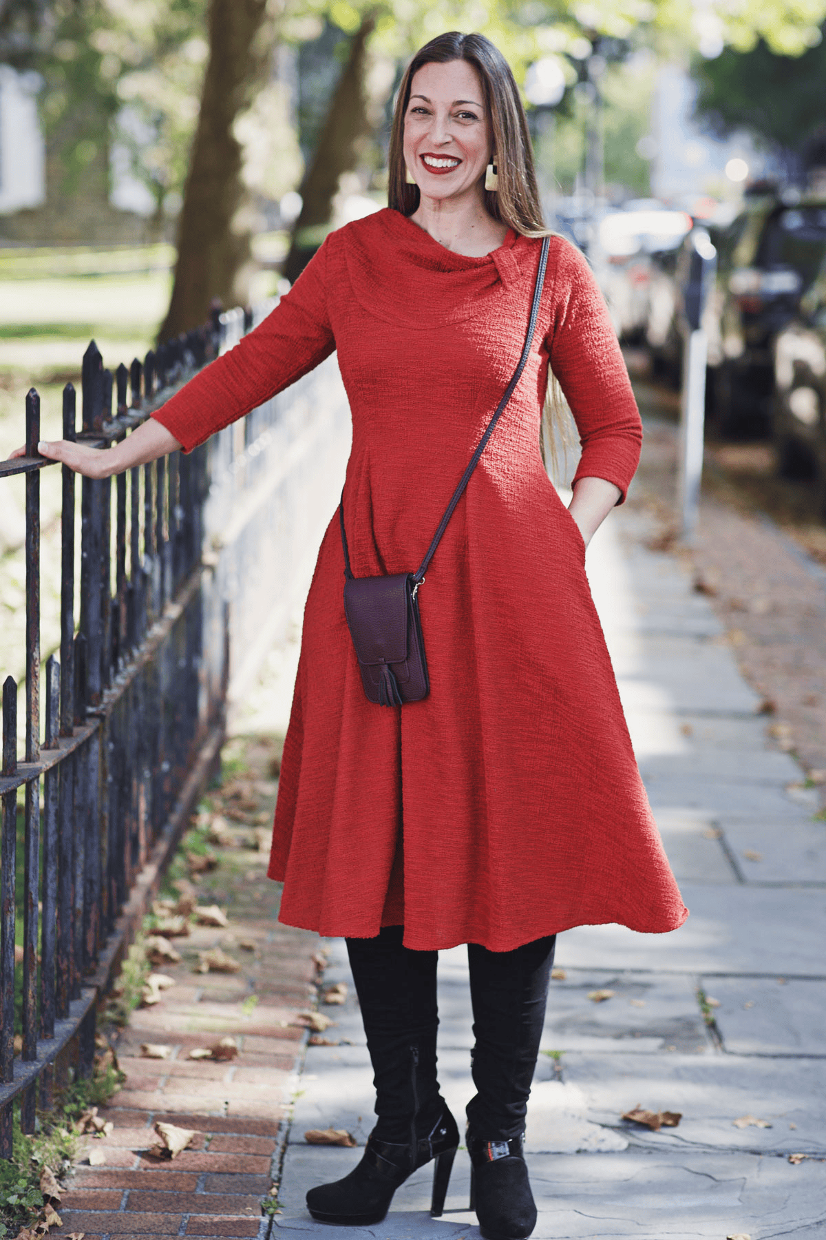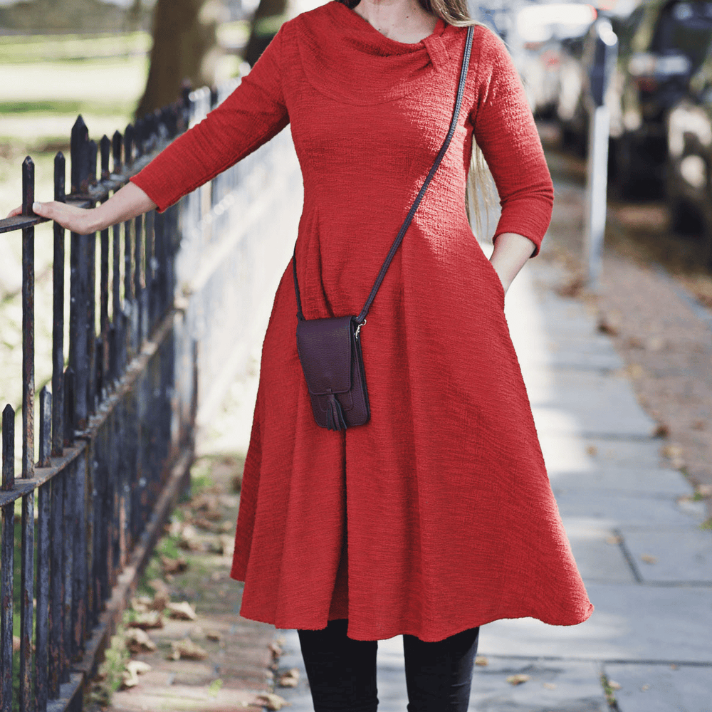 You are going to love our Claire Dress! It might be a simple sheath-style but there's more to this dress than meets the eye. The flattering asymmetrical draped collar adds visual interest and sophistication. The fisheye darts in both the front and back give shape at the waist without the fuss of a waistband. Finally, we had to include two in-seam skirt pockets because.... who doesn't love pockets! This rust boucle fabric is machine washable, wrinkle-free and made with love in the U.S.A.