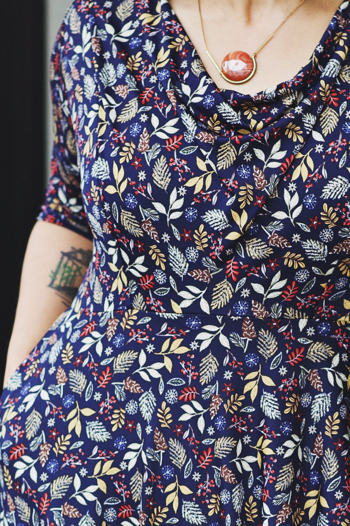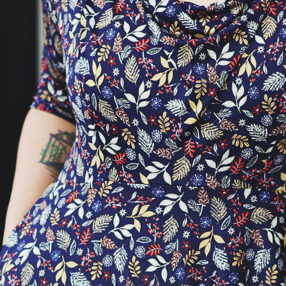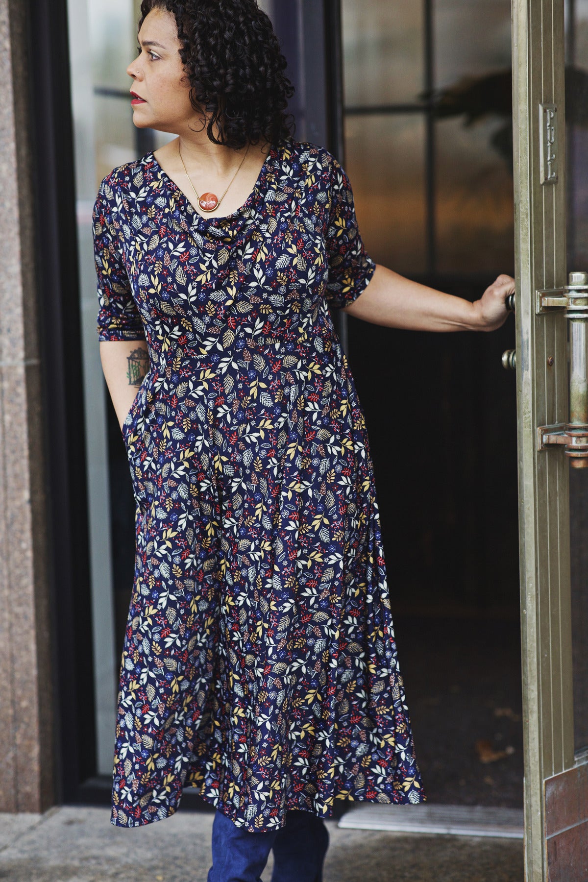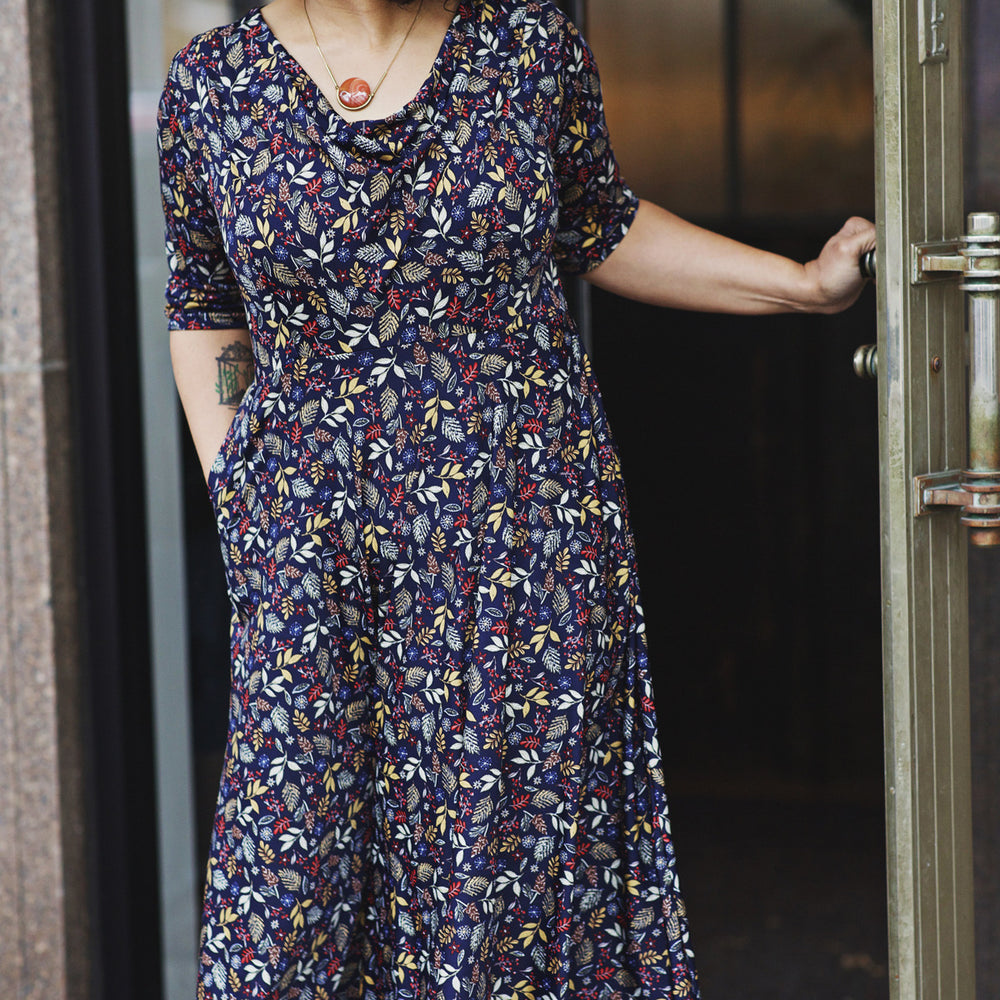 Our Connie dress features a draped cowl neck bodice with elbow length sleeves. It has an empire waist and a midi length skirt with pockets. Wear it to work or to a wedding! However you style this festive, dark blue and patterned dress, you can be assured to feel confident, comfortable and stylish! Made with love in the USA from machine washable polyester/spandex.