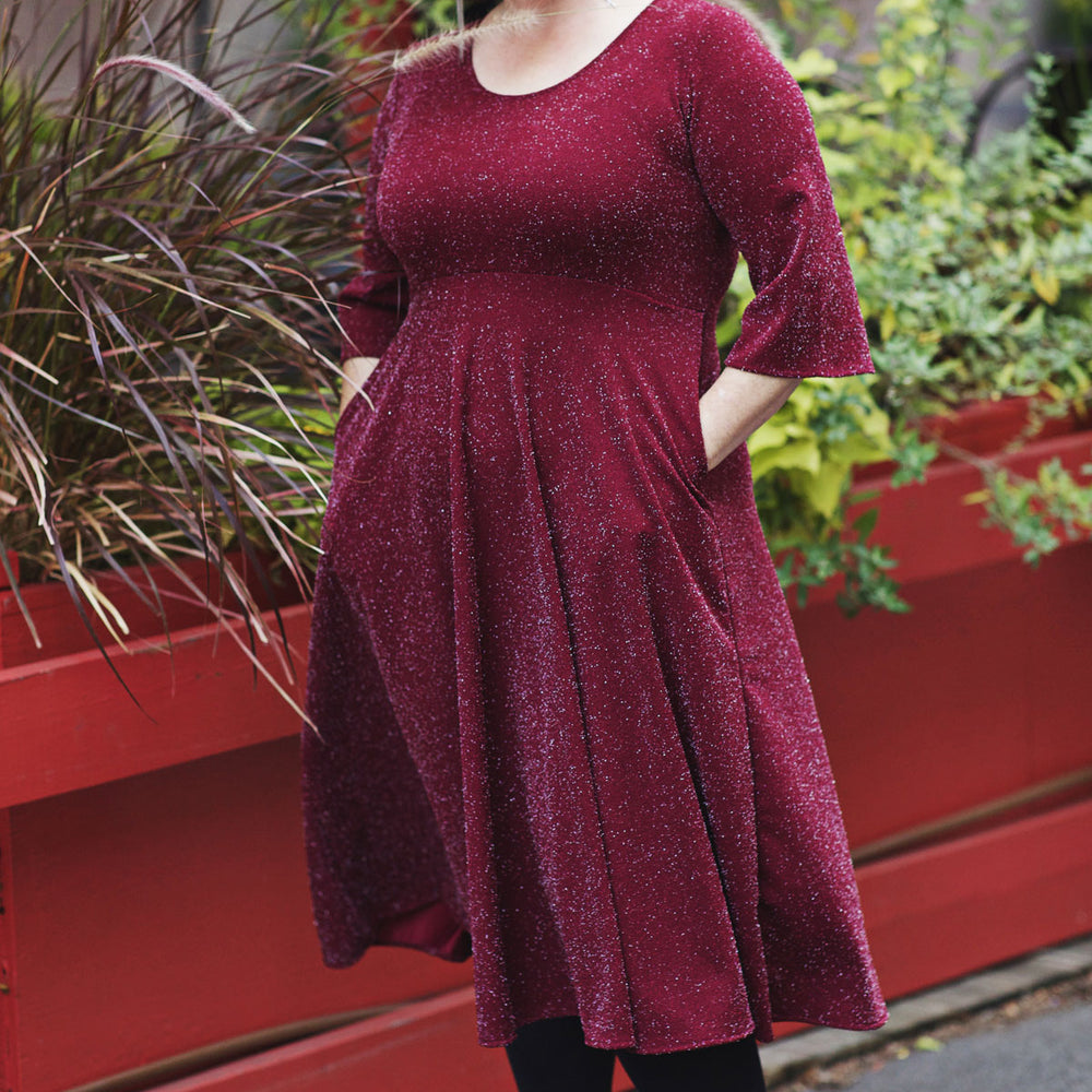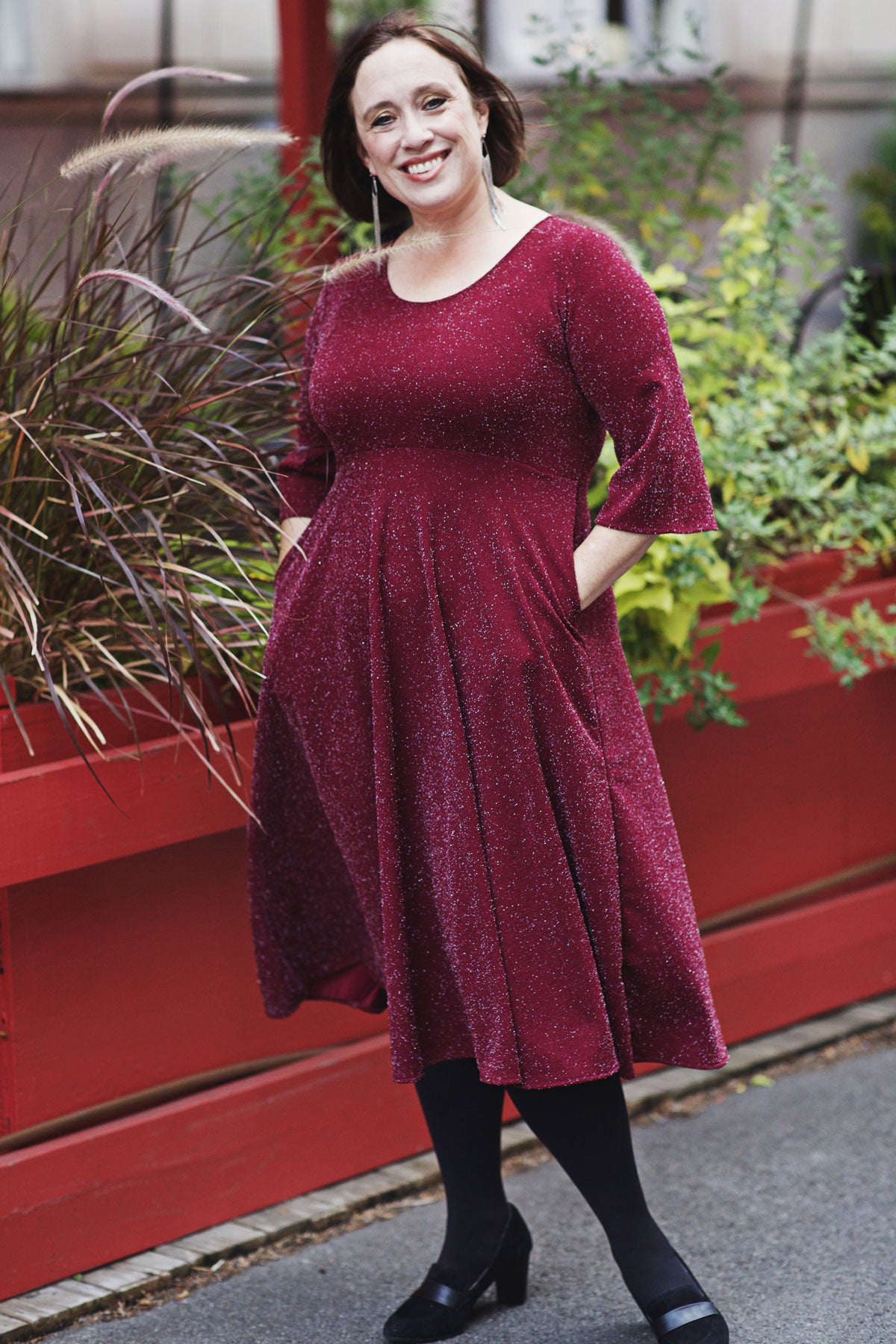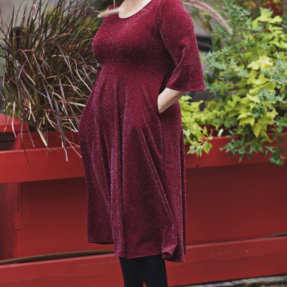 What a lovely Emily Dress! This dress features a rounded scoop neck bodice and 3/4 sleeves for a relaxed, casual yet elegant fit. The midi-length skirt falls below the knee and conveniently has pockets. Made from wrinkle-free burgundy sparkle fabric (polyester/spandex), it's easy to care for and proudly made in the USA.