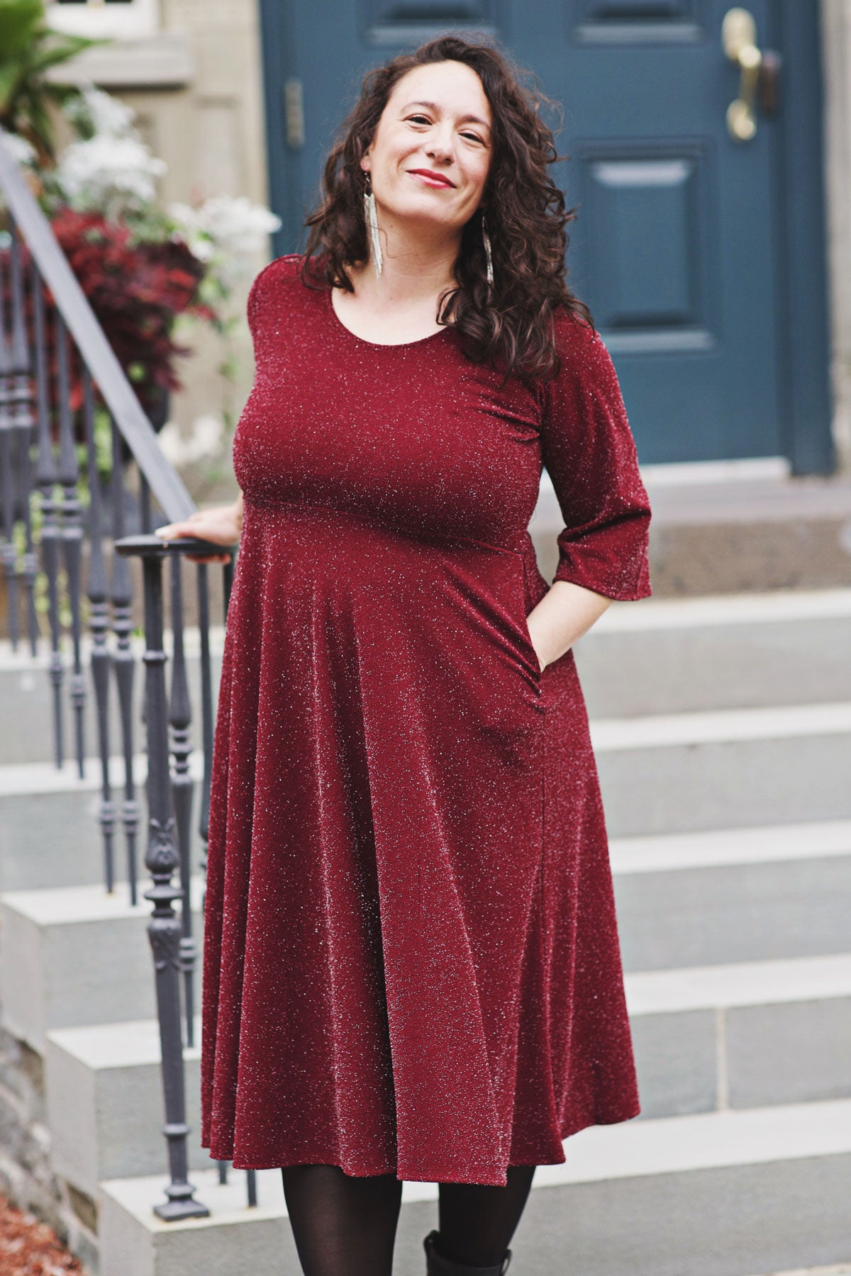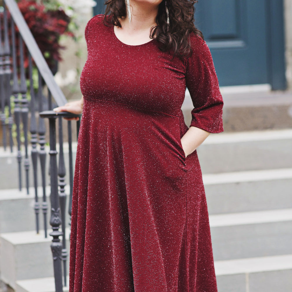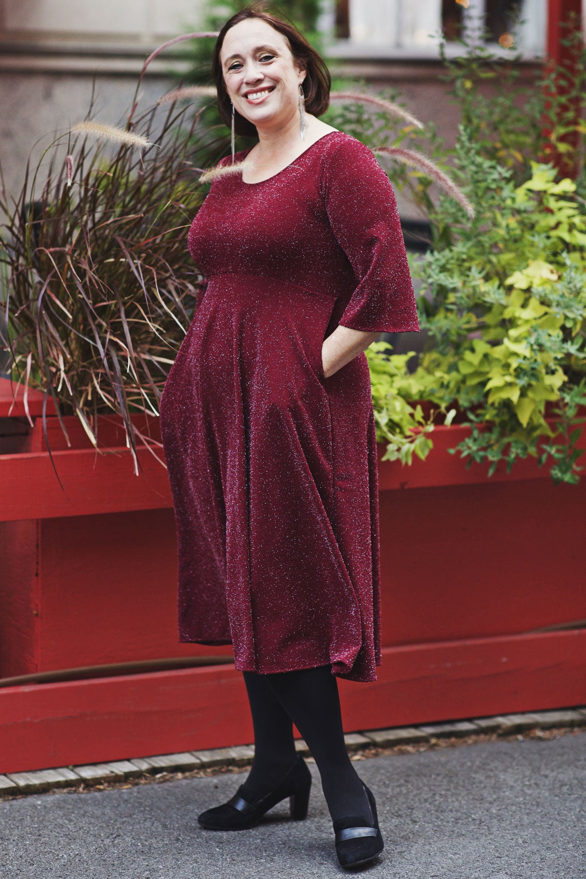 What a lovely Emily Dress! This dress features a rounded scoop neck bodice and 3/4 sleeves for a relaxed, casual yet elegant fit. The midi-length skirt falls below the knee and conveniently has pockets. Made from wrinkle-free burgundy sparkle fabric (polyester/spandex), it's easy to care for and proudly made in the USA.