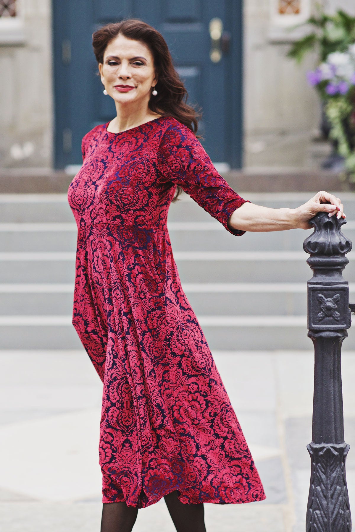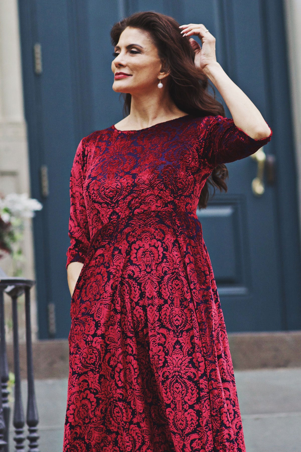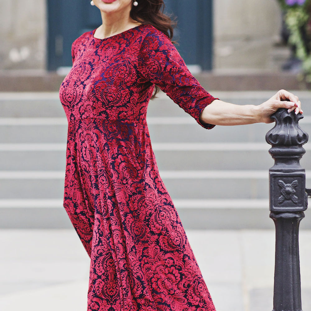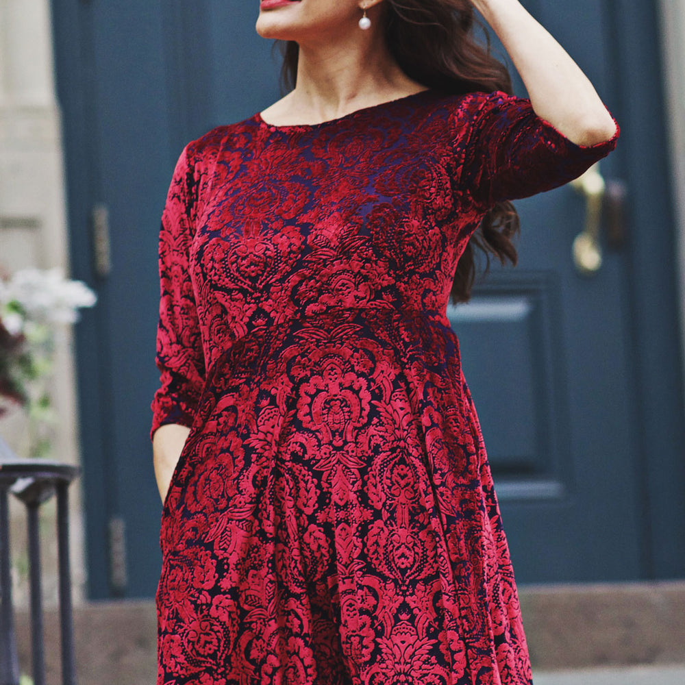Our Katherine Dress is made with comfort and style in mind. Featuring a scoop neckline, 3/4 sleeves, and midi length skirt, this dress keeps you chic with ease. Plus, it's made from wrinkle-free fabric stretch velvet (polyester/spandex) that's machine washable and proudly made in the U.S.A. The best part? POCKETS! So you can look and feel great all day.
