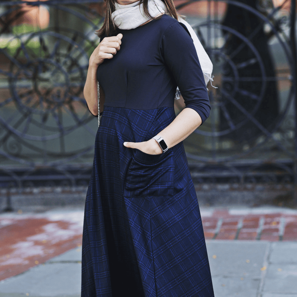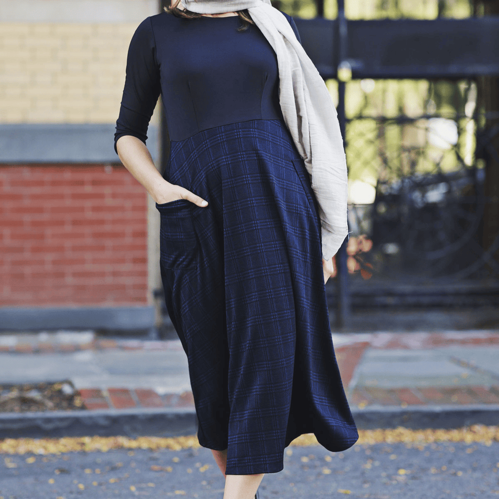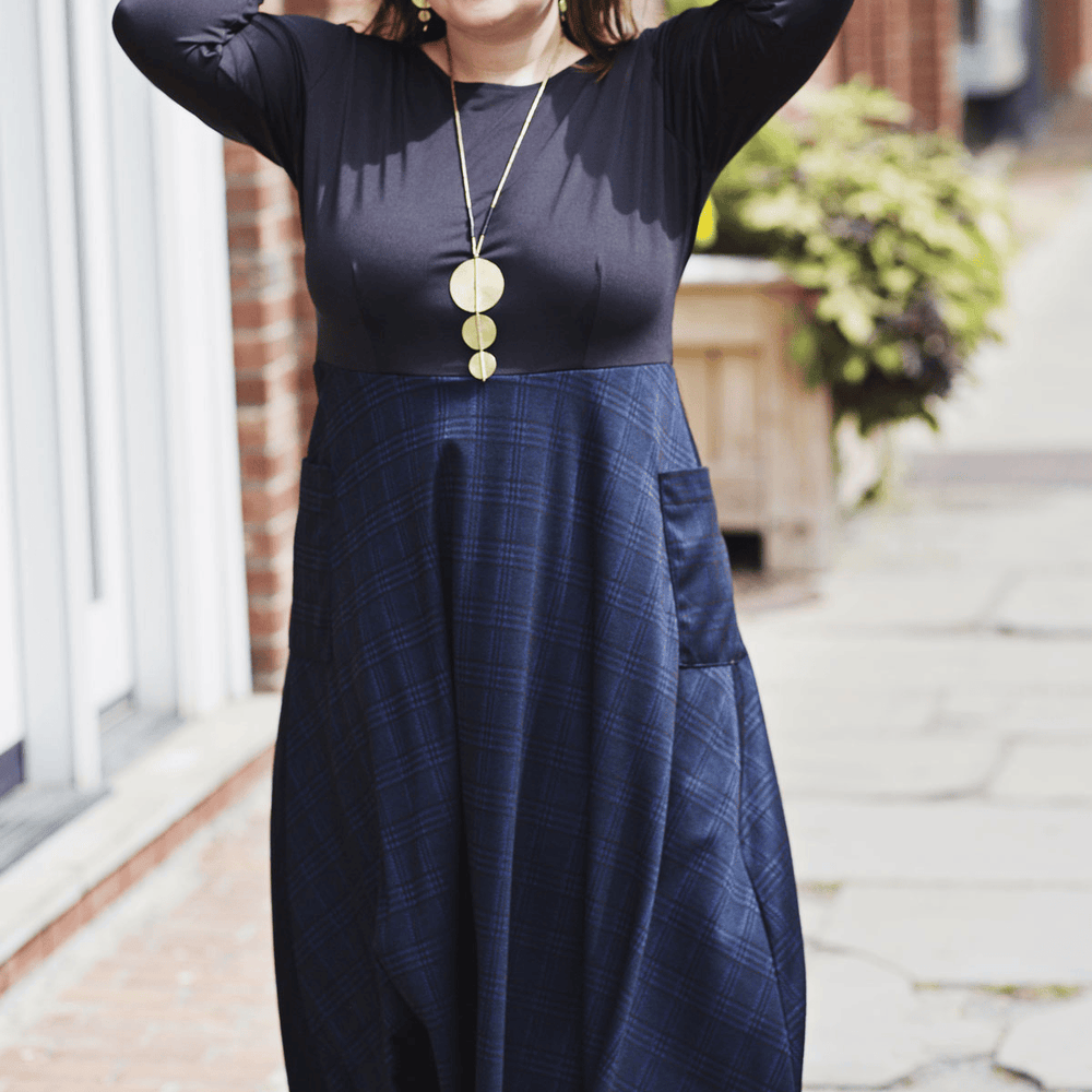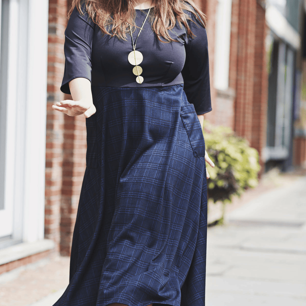 Say hello to the Kitty Dress! This dress has the look of a shirt/skirt combo but without any of the fuss that comes along with that! This one piece dress features a solid black bodice with a midi length navy and black plaid skirt. The skirt also features 2 large patch pockets on the side. Add your favorite belt for a put together look for the office. Or wear it as is! This polyester/spandex jacquard dress is proudly made in the USA.