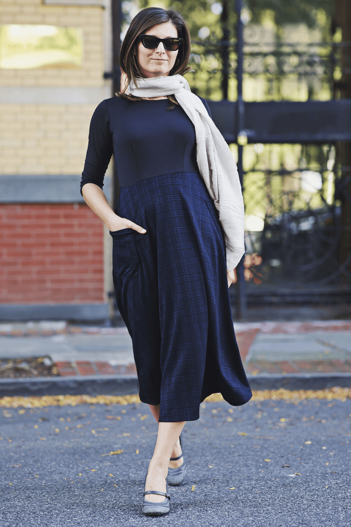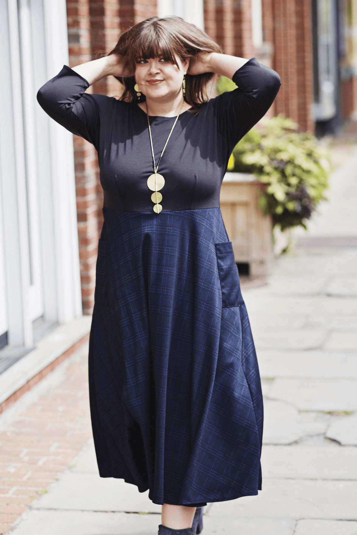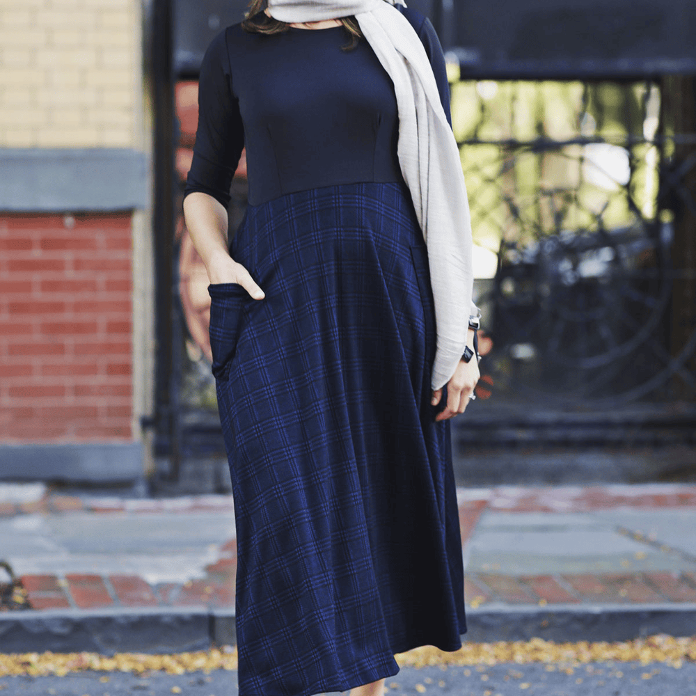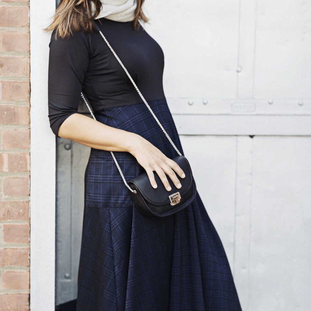 Say hello to the Kitty Dress! This dress has the look of a shirt/skirt combo but without any of the fuss that comes along with that! This one piece dress features a solid black bodice with a midi length navy and black plaid skirt. The skirt also features 2 large patch pockets on the side. Add your favorite belt for a put together look for the office. Or wear it as is! This polyester/spandex jacquard dress is proudly made in the USA.
