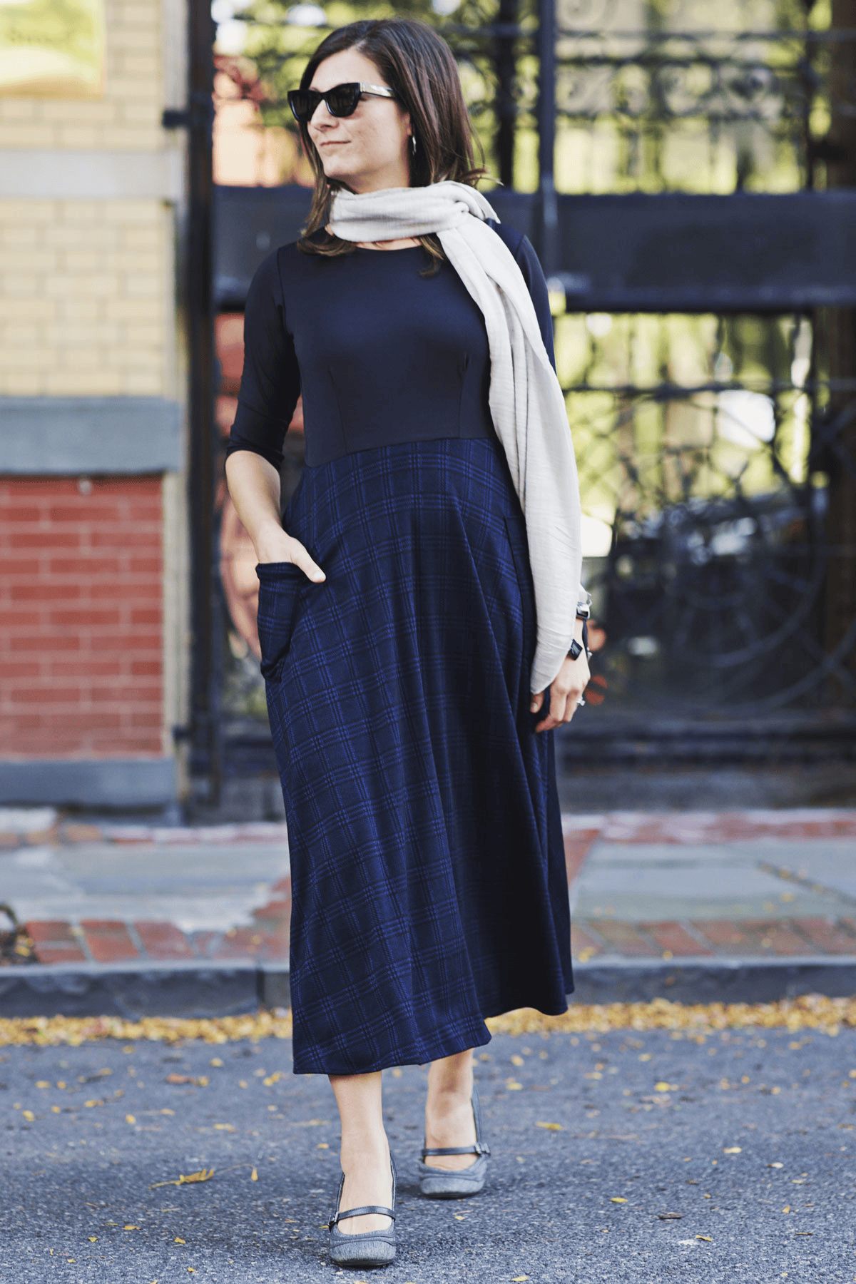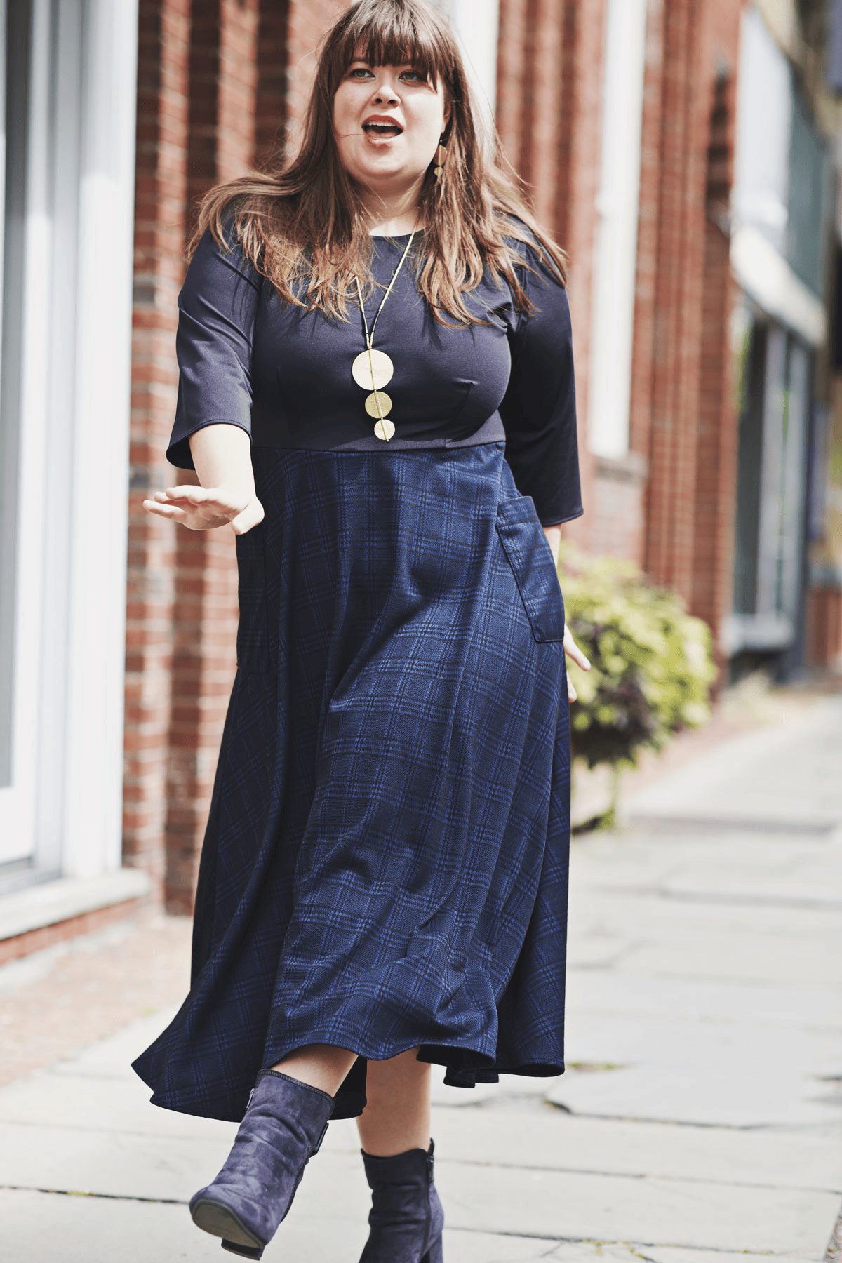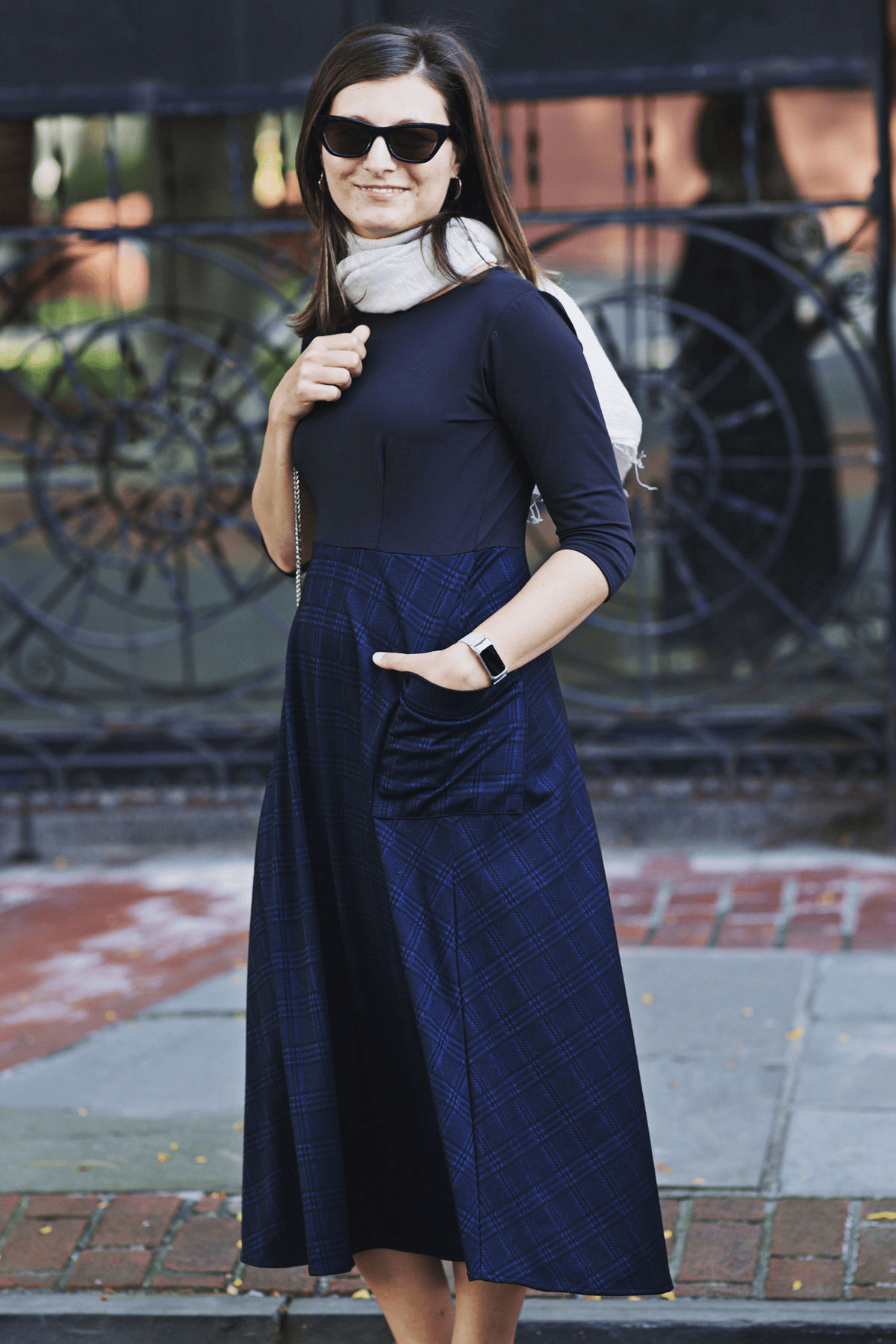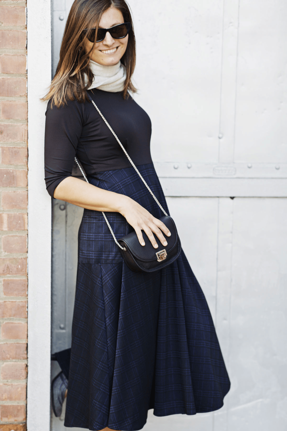 Say hello to the Kitty Dress! This dress has the look of a shirt/skirt combo but without any of the fuss that comes along with that! This one piece dress features a solid black bodice with a midi length navy and black plaid skirt. The skirt also features 2 large patch pockets on the side. Add your favorite belt for a put together look for the office. Or wear it as is! This polyester/spandex jacquard dress is proudly made in the USA.