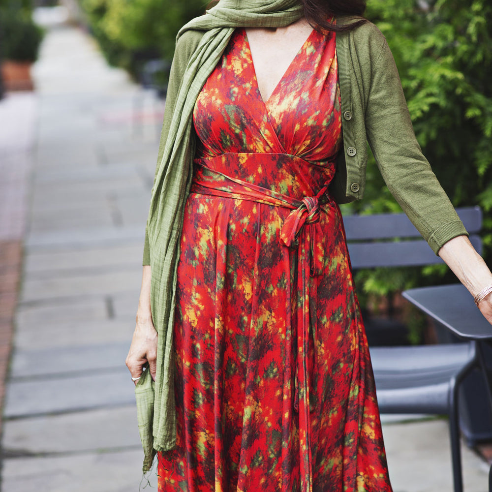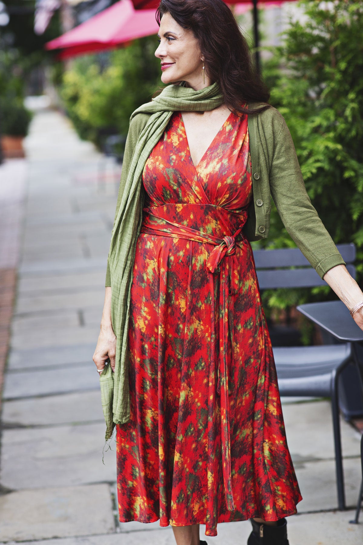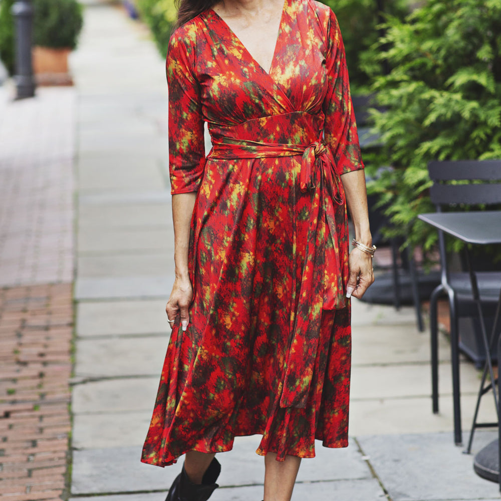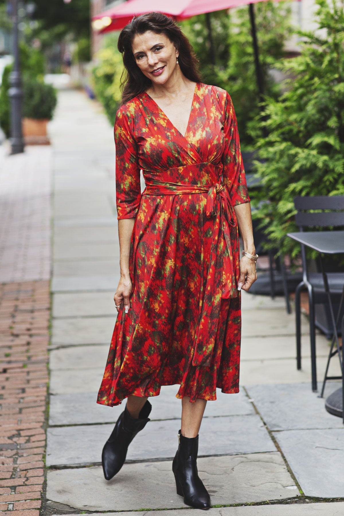 See why Karina fans love our Margaret Dress! This versatile dress features a abstract print filled with all the vibrant colors of autumn. The cross-over V neck bodice and attached sash accentuate your figure, while the wrinkle-free fabric (polyester/spandex) makes it easy to care for. Proudly made in the U.S.A.