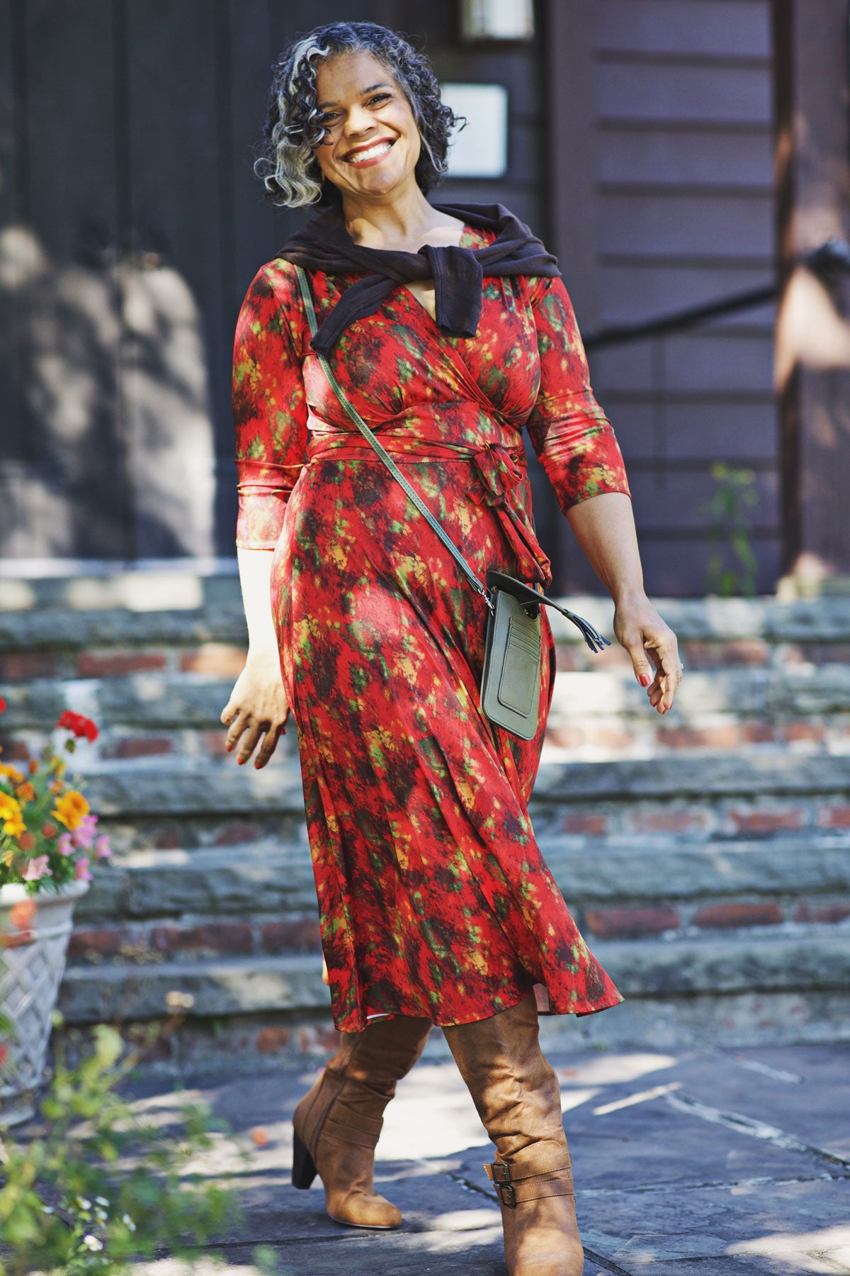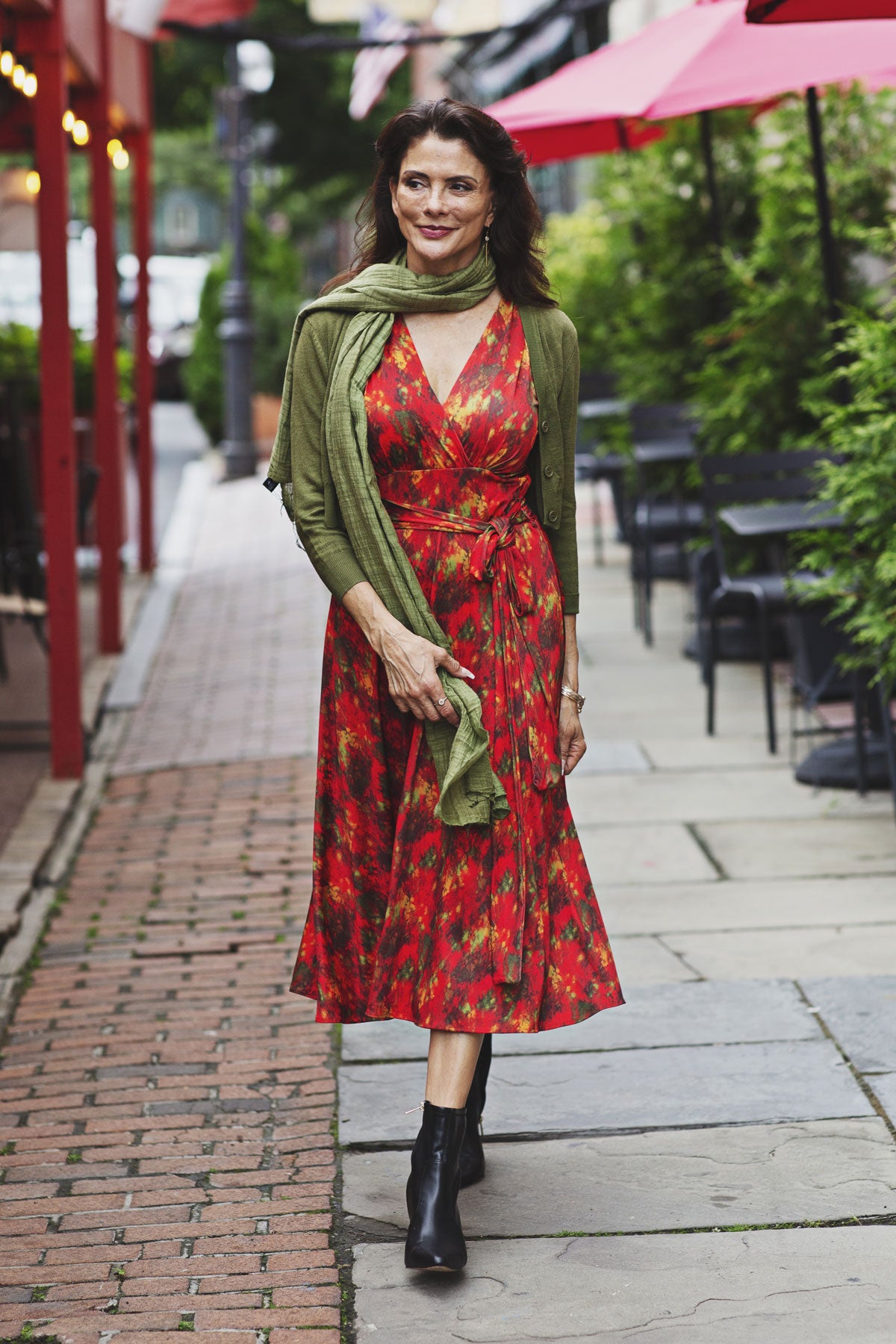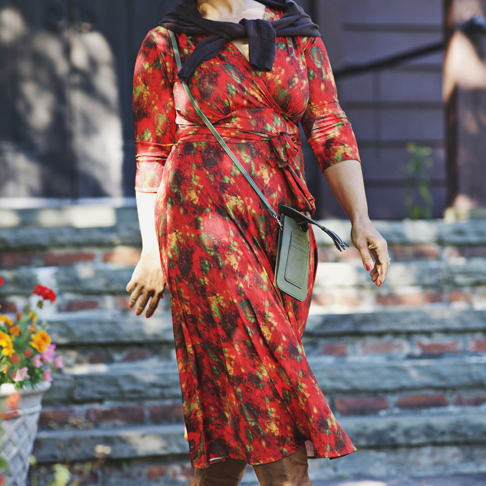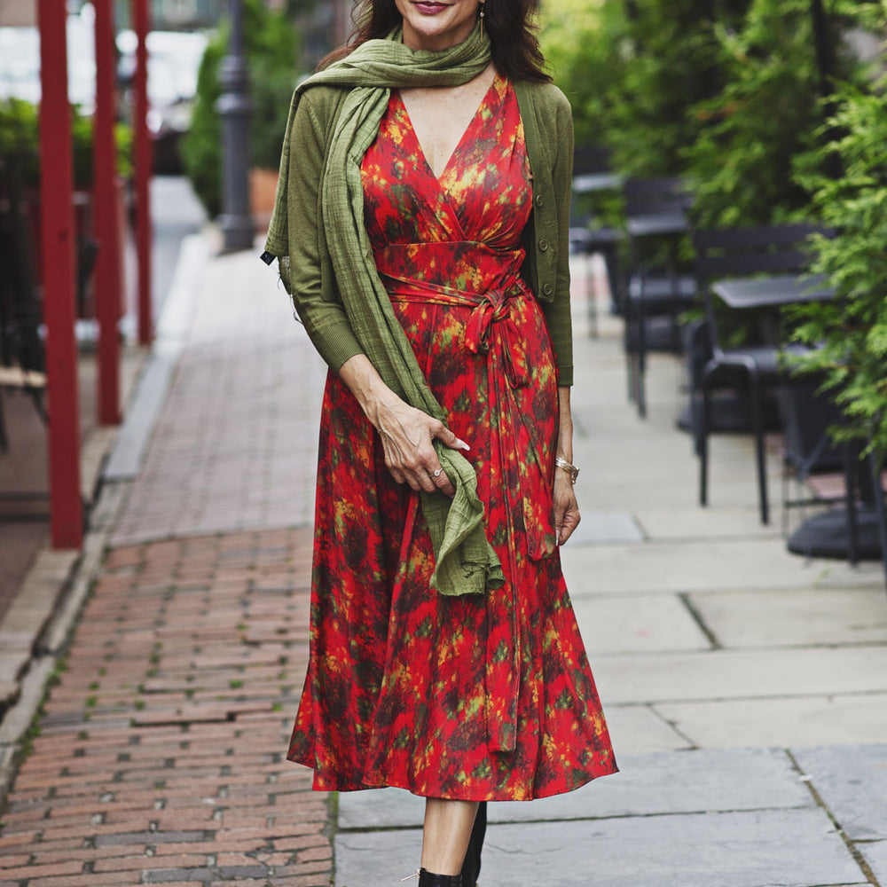 See why Karina fans love our Margaret Dress! This versatile dress features a abstract print filled with all the vibrant colors of autumn. The cross-over V neck bodice and attached sash accentuate your figure, while the wrinkle-free fabric (polyester/spandex) makes it easy to care for. Proudly made in the U.S.A.