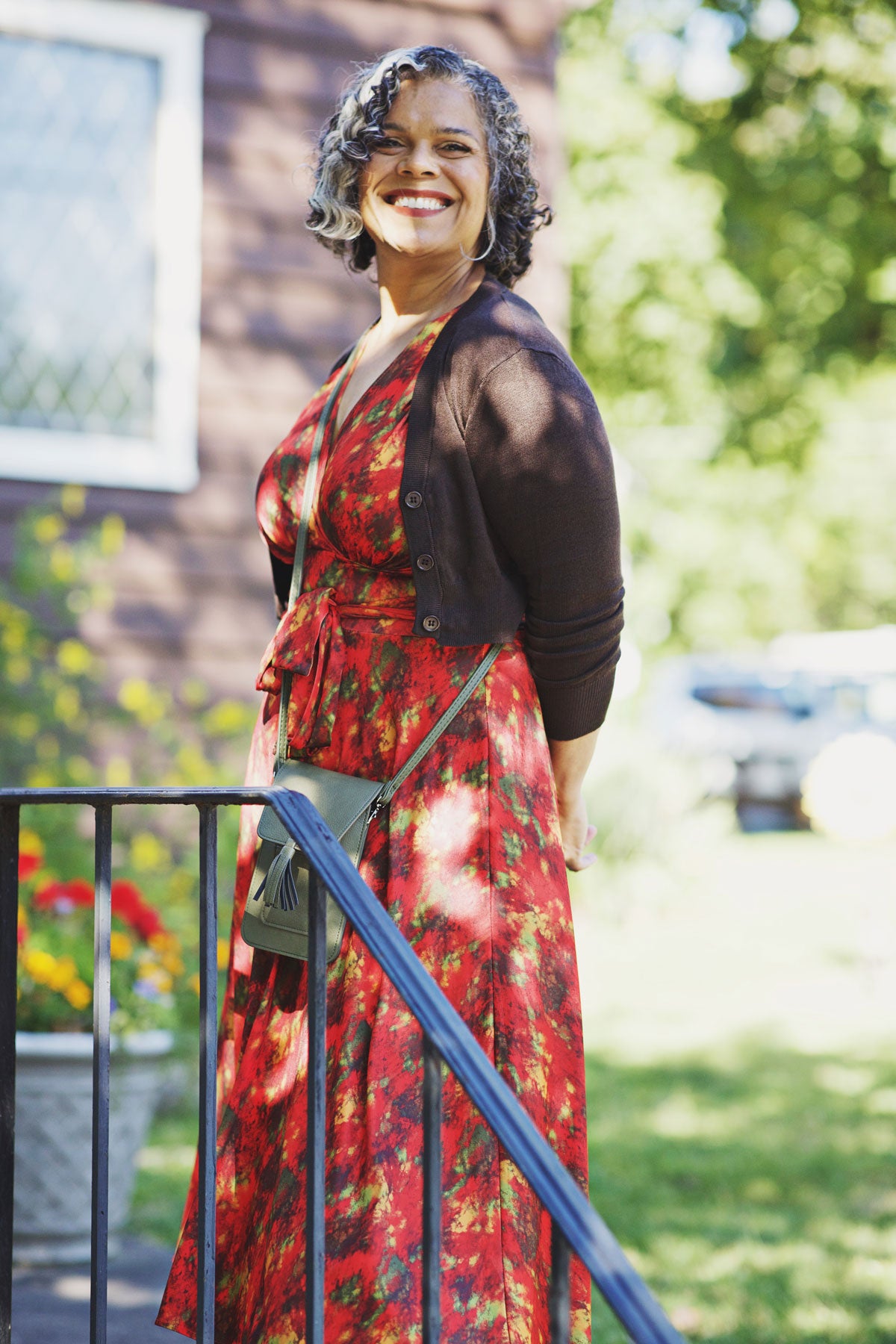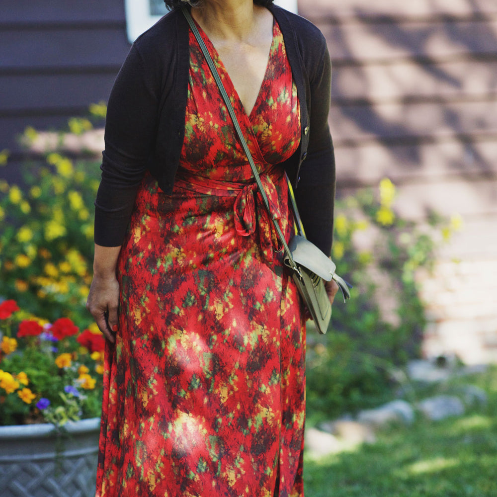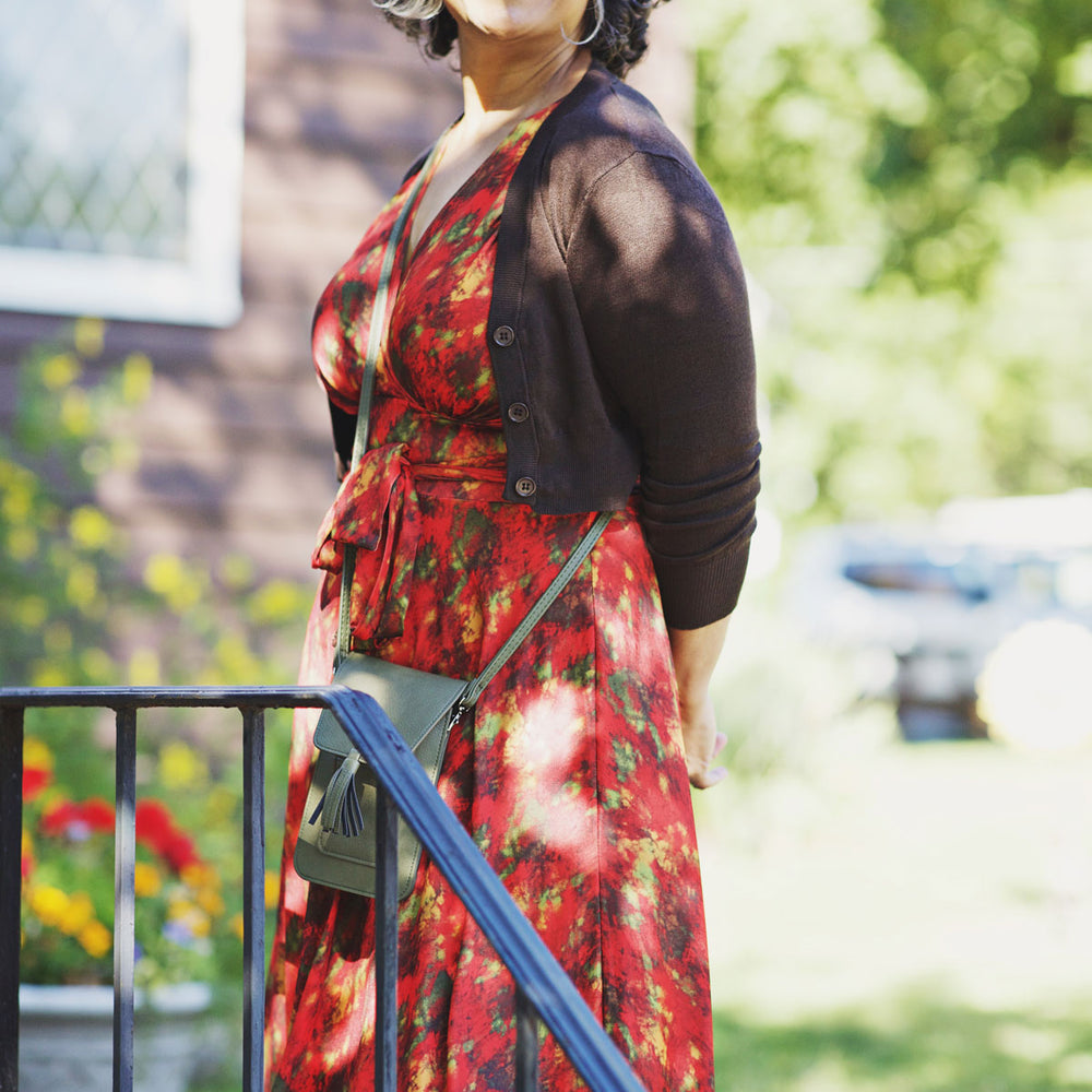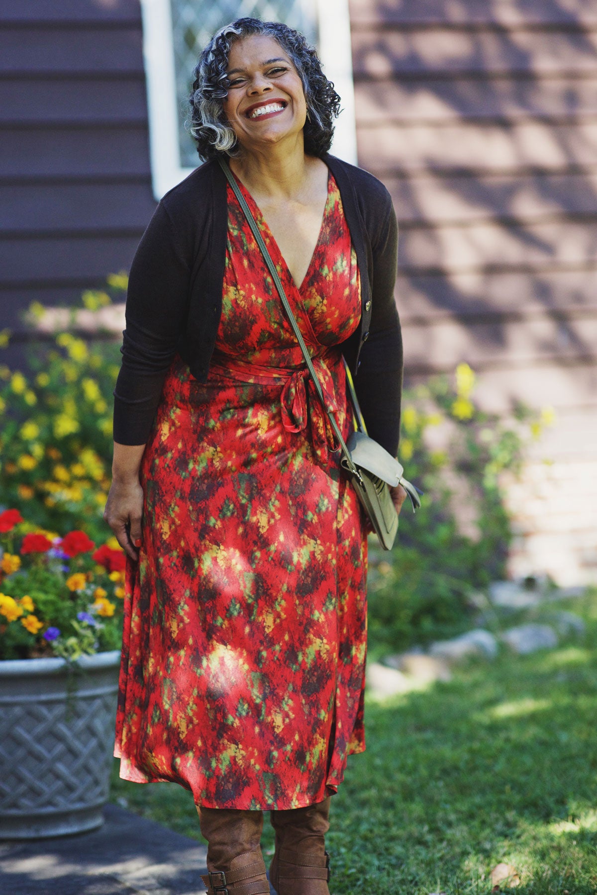 See why Karina fans love our Margaret Dress! This versatile dress features a abstract print filled with all the vibrant colors of autumn. The cross-over V neck bodice and attached sash accentuate your figure, while the wrinkle-free fabric (polyester/spandex) makes it easy to care for. Proudly made in the U.S.A.