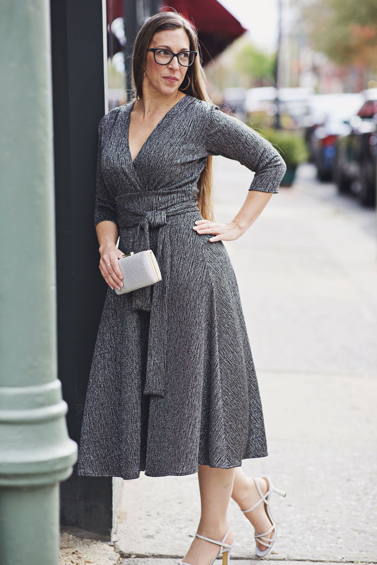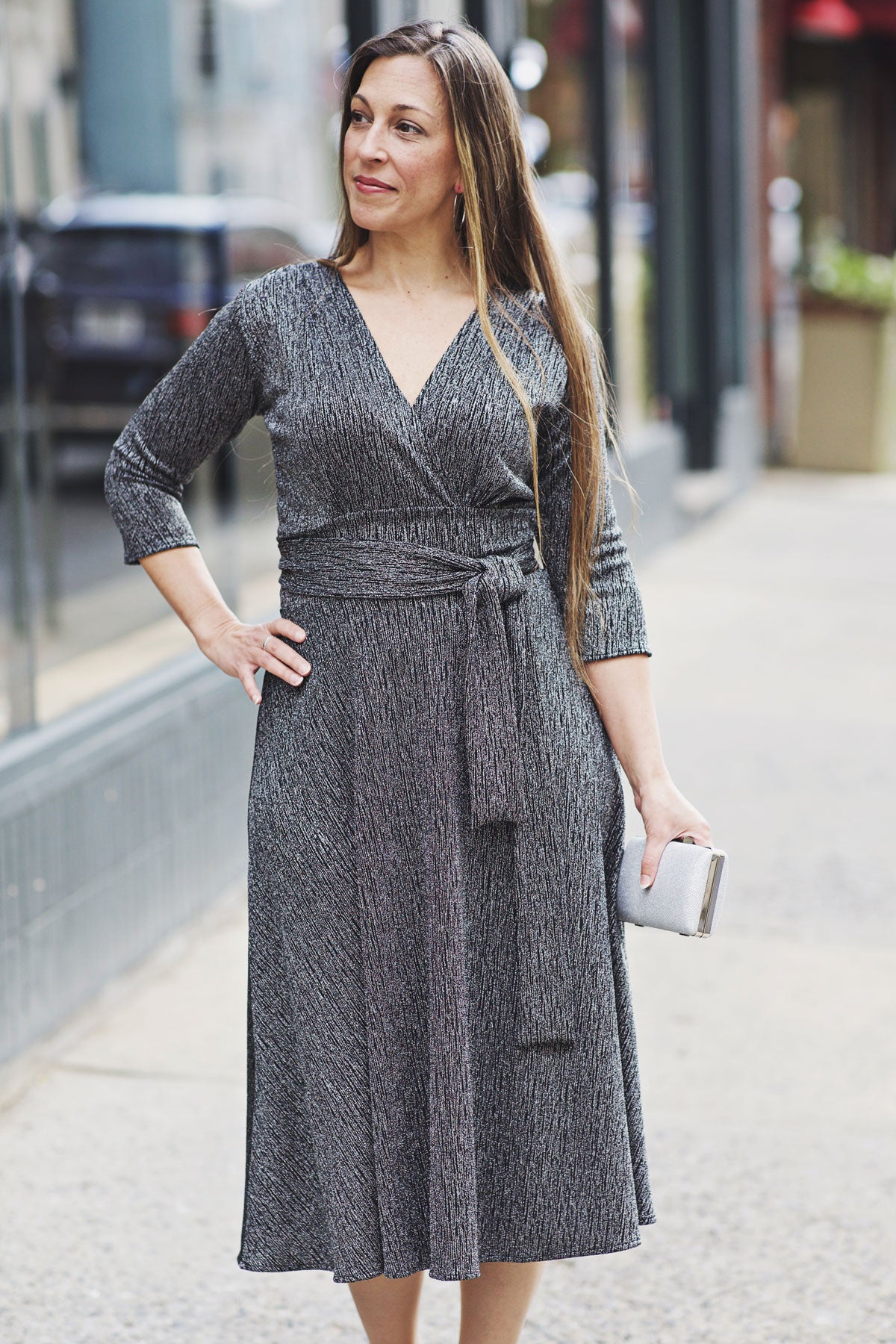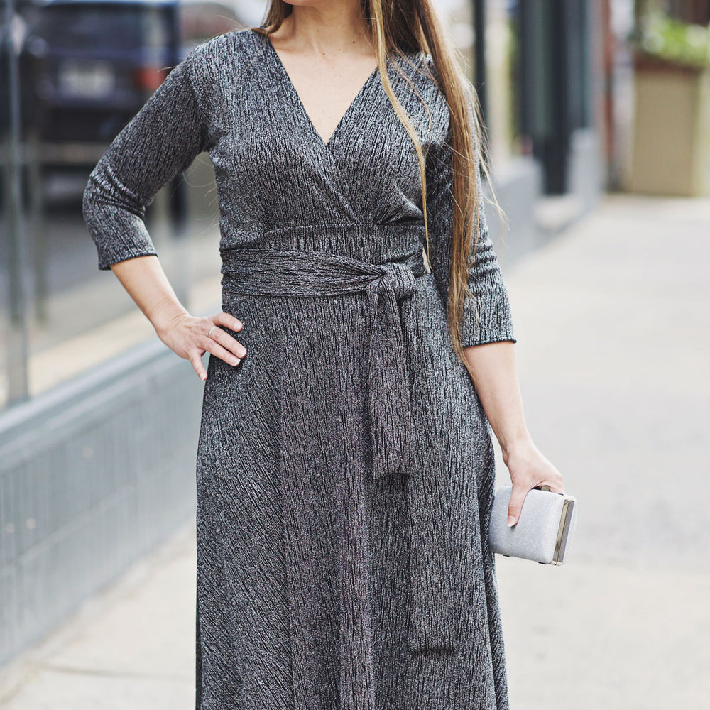 See why Karina fans love our Margaret Dress! This versatile dress features an amazing black metallic sparkle fabric. The cross-over V neck bodice and attached sash accentuate your figure, while the wrinkle-free fabric (polyester/spandex) makes it easy to care for. Proudly made in the U.S.A.