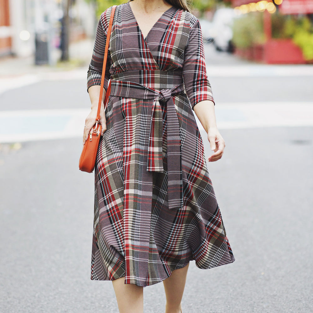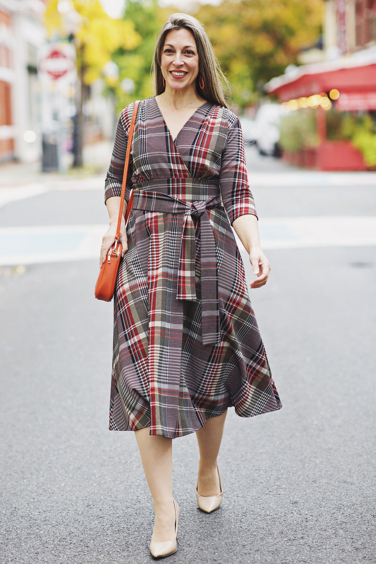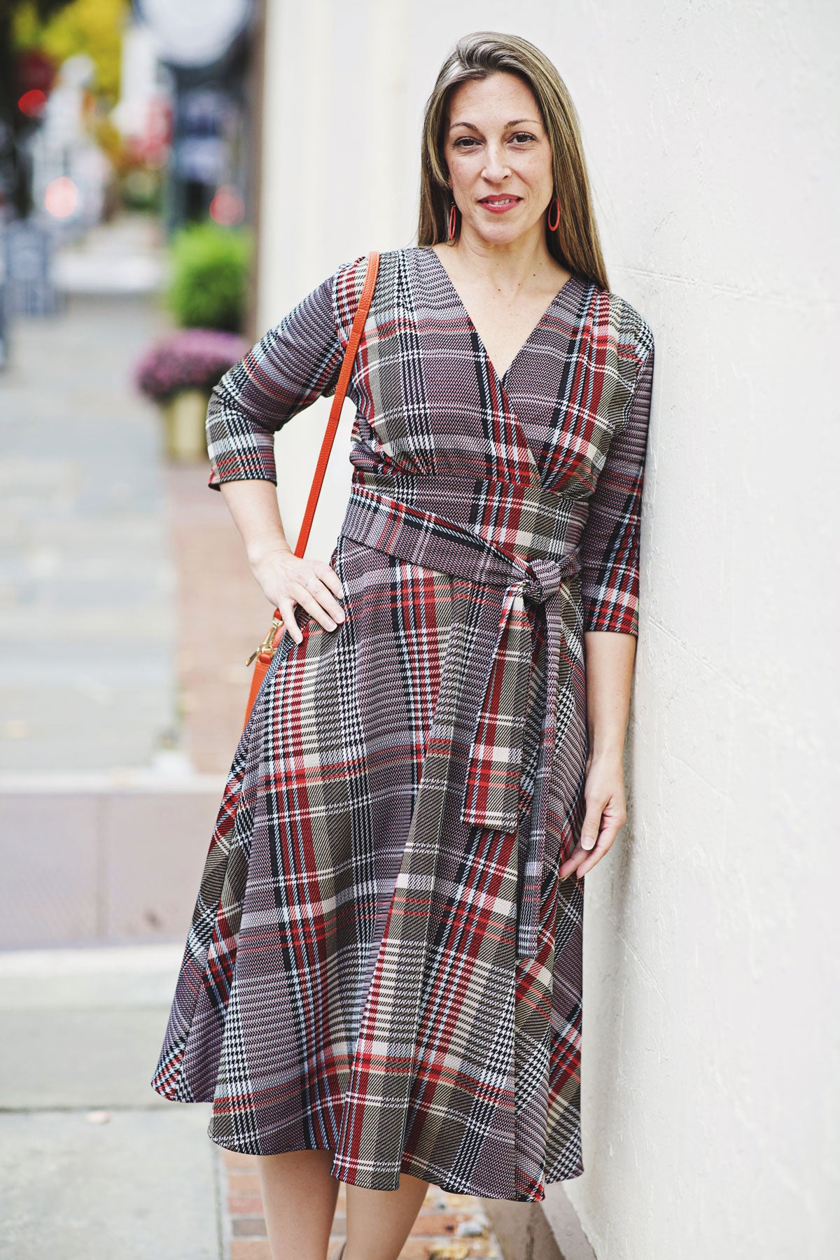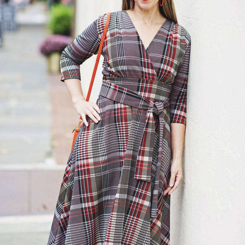 See why Karina fans love our Margaret Dress! This versatile dress features a classic plaid print with shades of khaki, red, gray and black. The cross-over V neck bodice and attached sash accentuate your figure, while the wrinkle-free fabric (polyester/spandex) makes it easy to care for. Proudly made in the U.S.A.