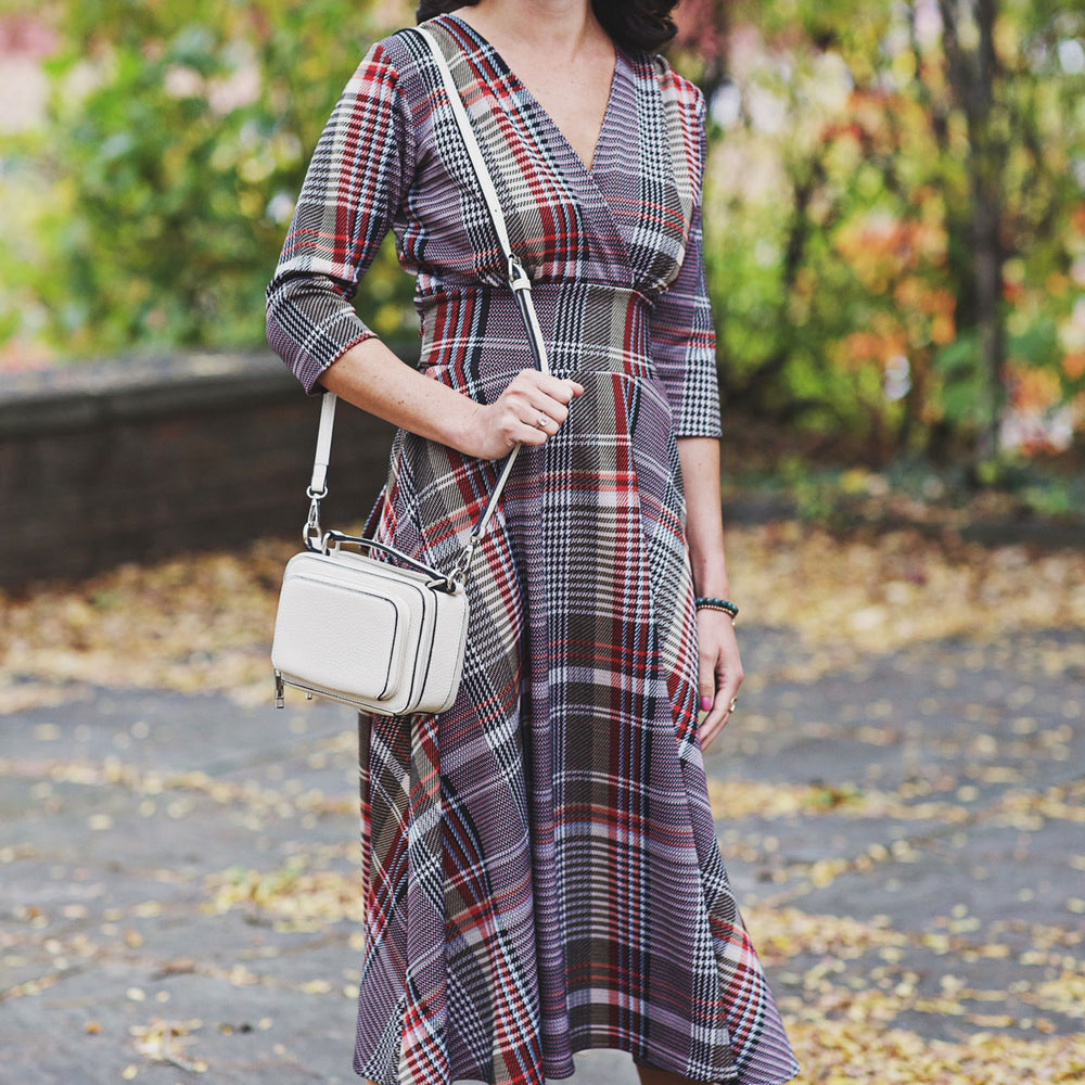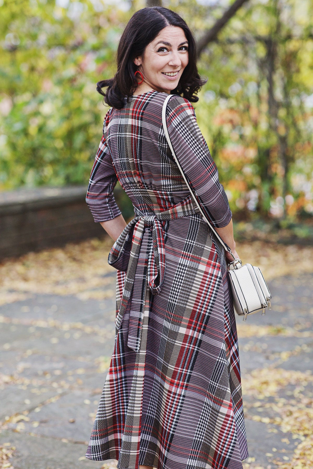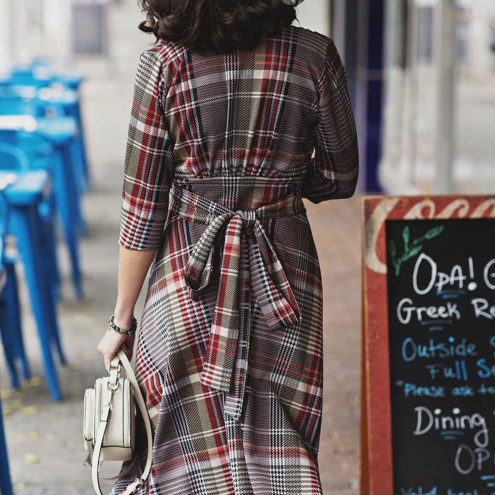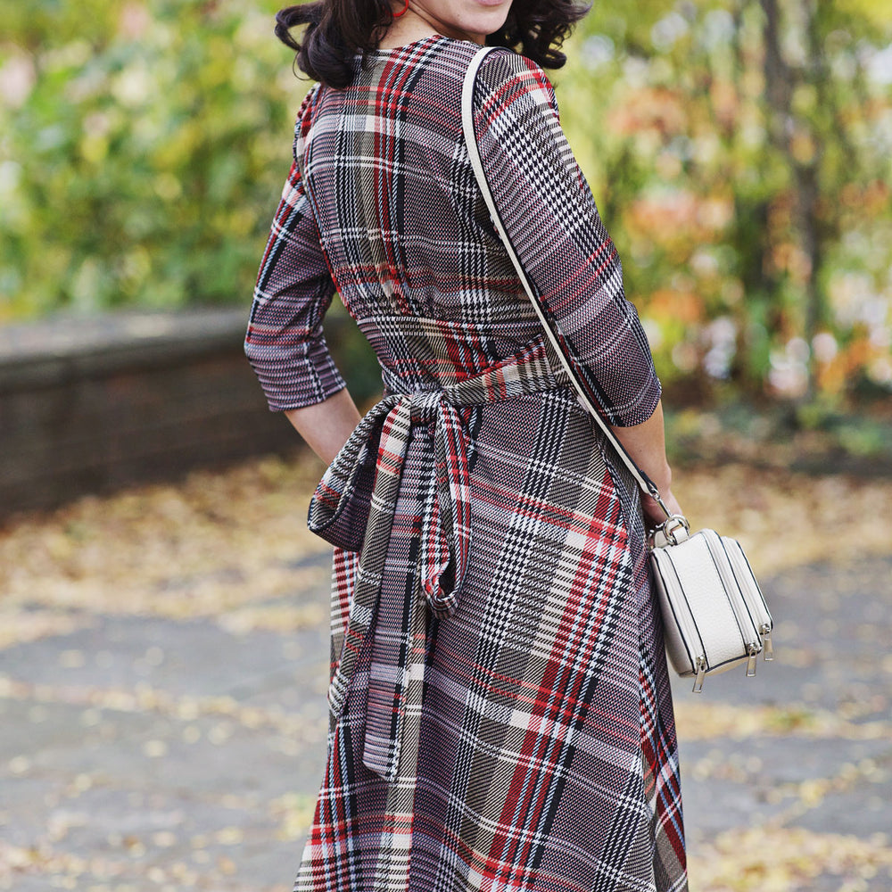 See why Karina fans love our Margaret Dress! This versatile dress features a classic plaid print with shades of khaki, red, gray and black. The cross-over V neck bodice and attached sash accentuate your figure, while the wrinkle-free fabric (polyester/spandex) makes it easy to care for. Proudly made in the U.S.A.