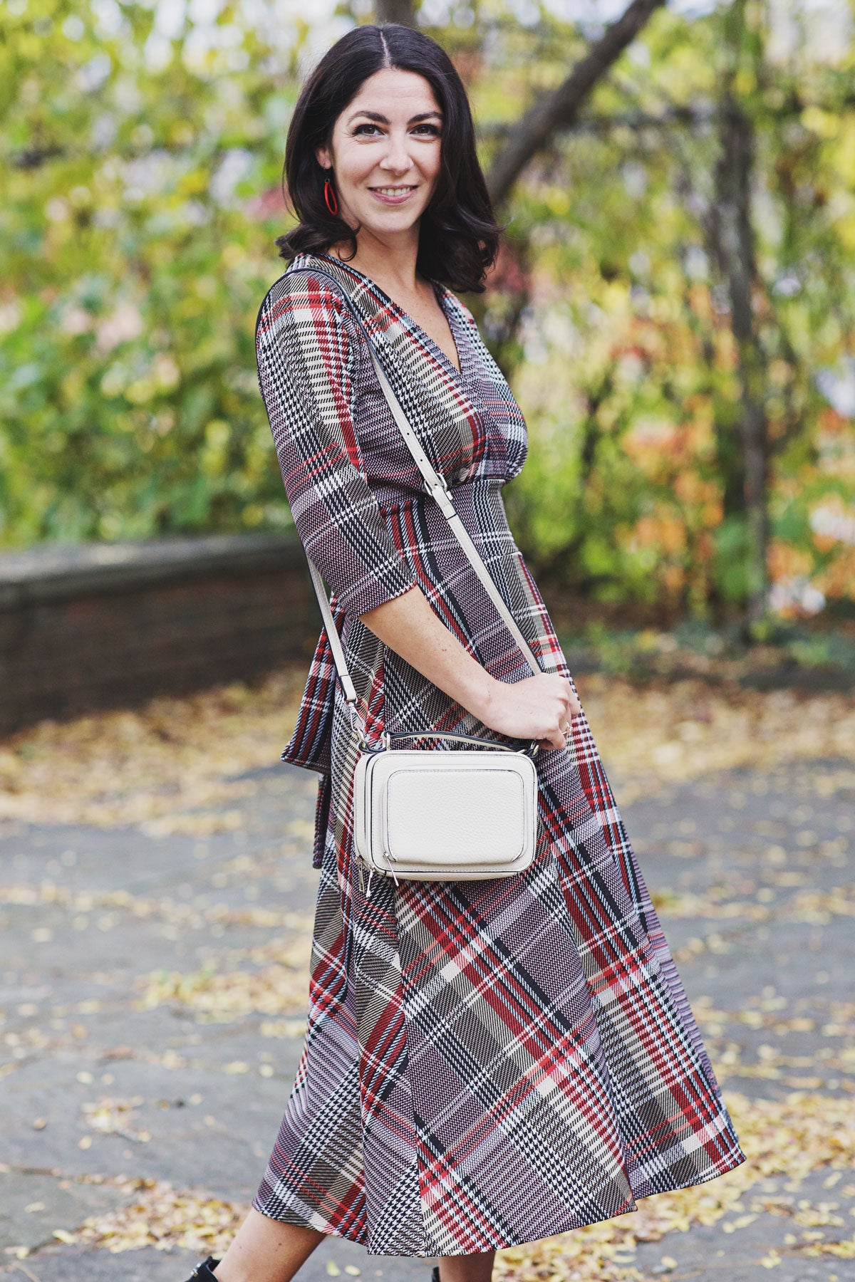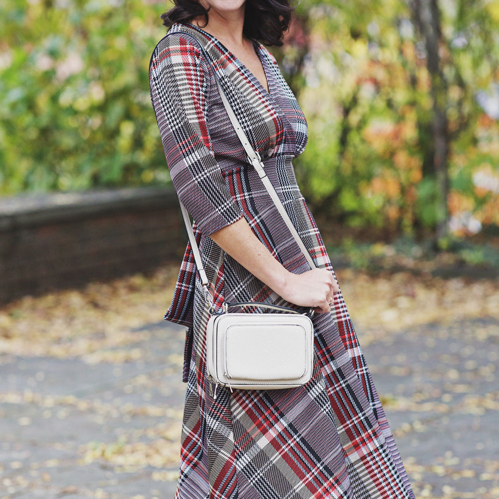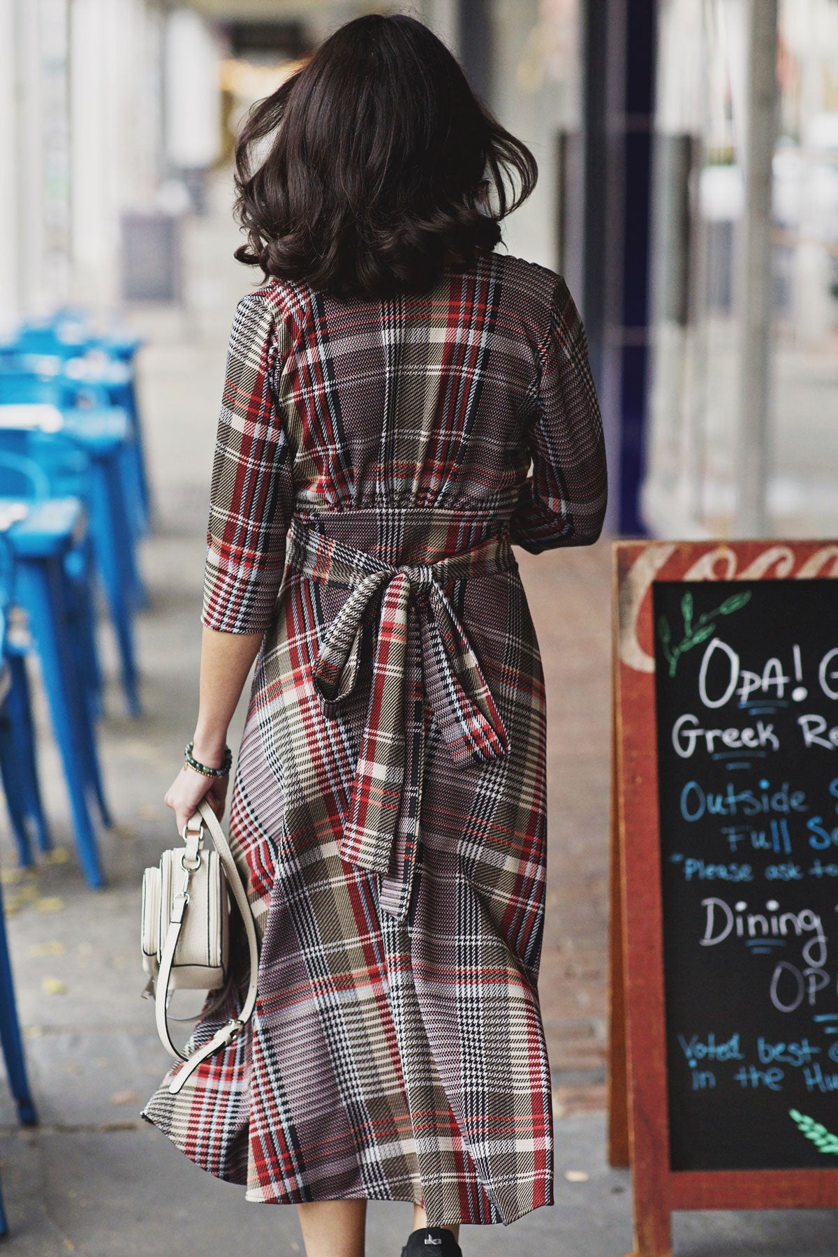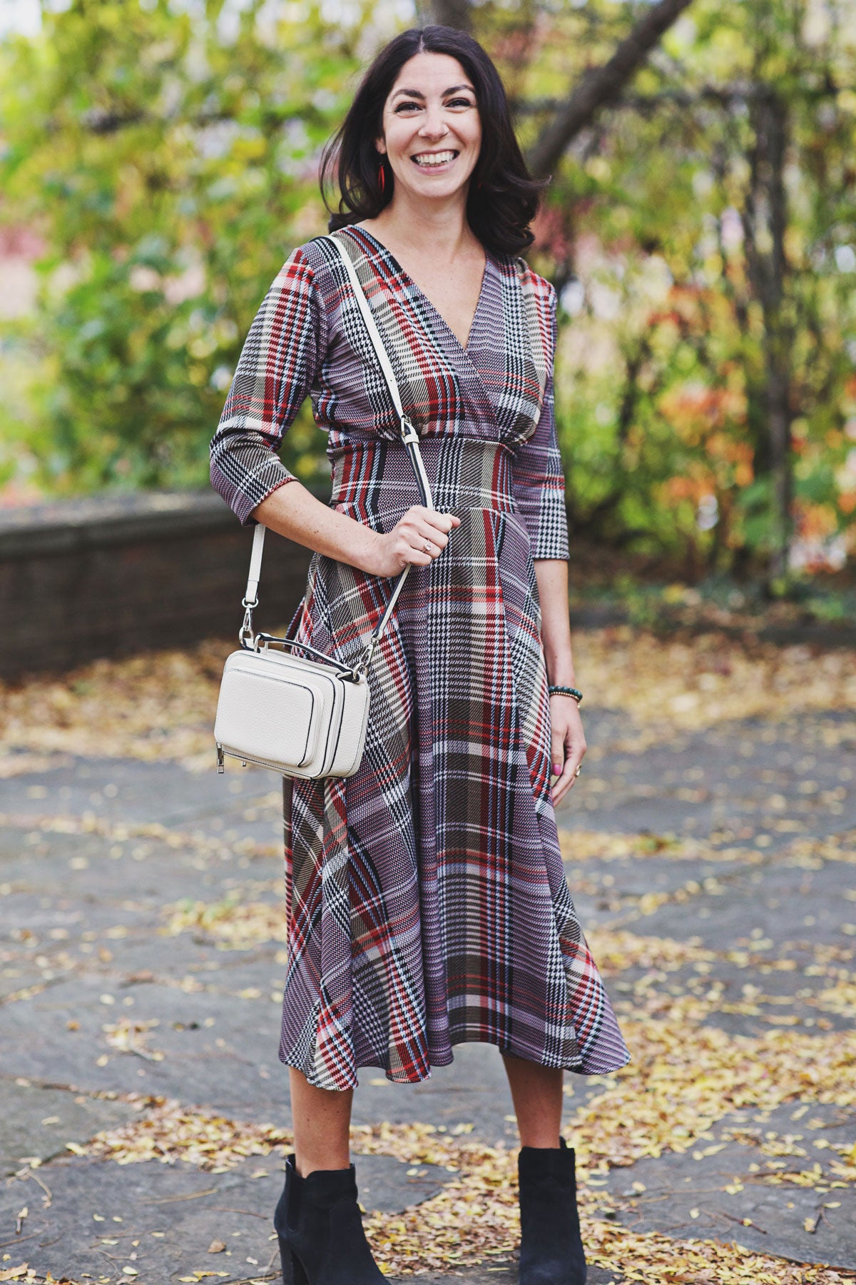 See why Karina fans love our Margaret Dress! This versatile dress features a classic plaid print with shades of khaki, red, gray and black. The cross-over V neck bodice and attached sash accentuate your figure, while the wrinkle-free fabric (polyester/spandex) makes it easy to care for. Proudly made in the U.S.A.