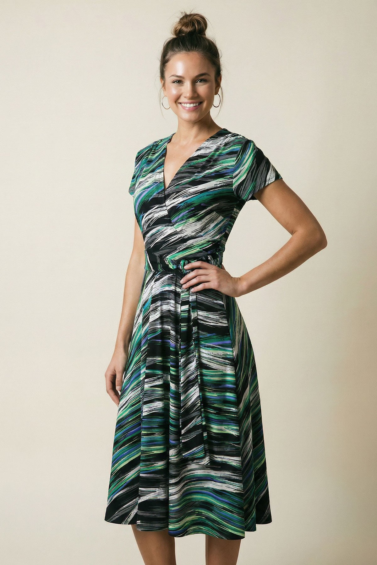 See why Karina fans love our Margaret Dress! This versatile dress features swirling shades of gray, chartreuse, cobalt blue and kelly green on a black background. The cross-over V neck bodice and attached sash accentuate your figure, while the wrinkle-free fabric (polyester/spandex) makes it easy to care for. Proudly made in the U.S.A.