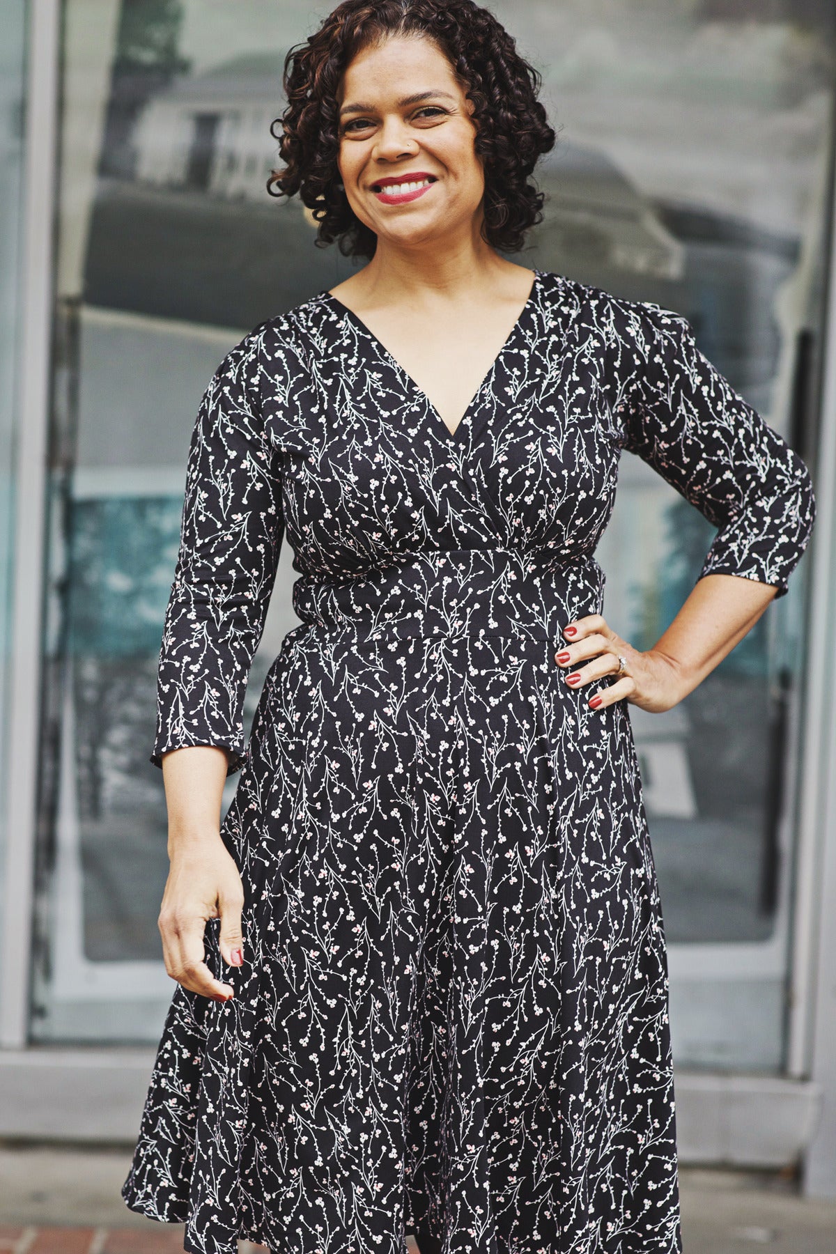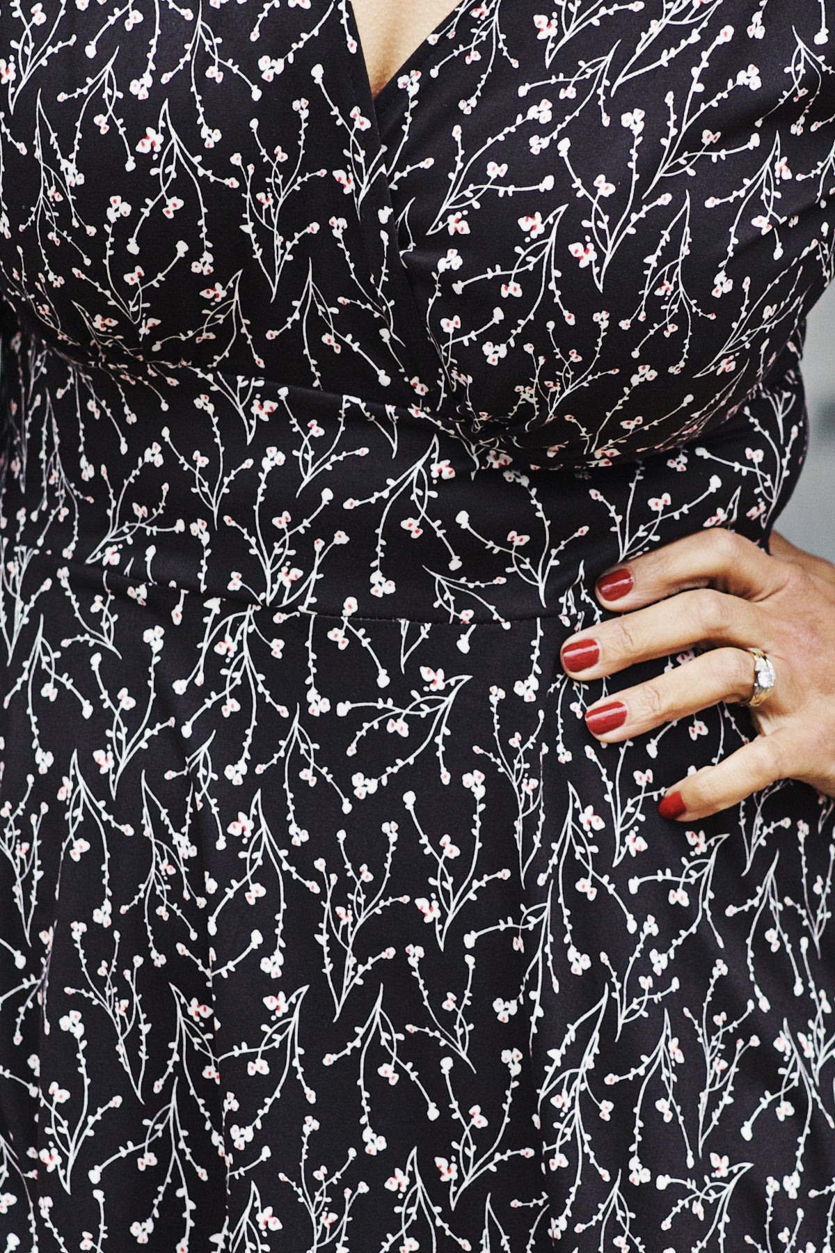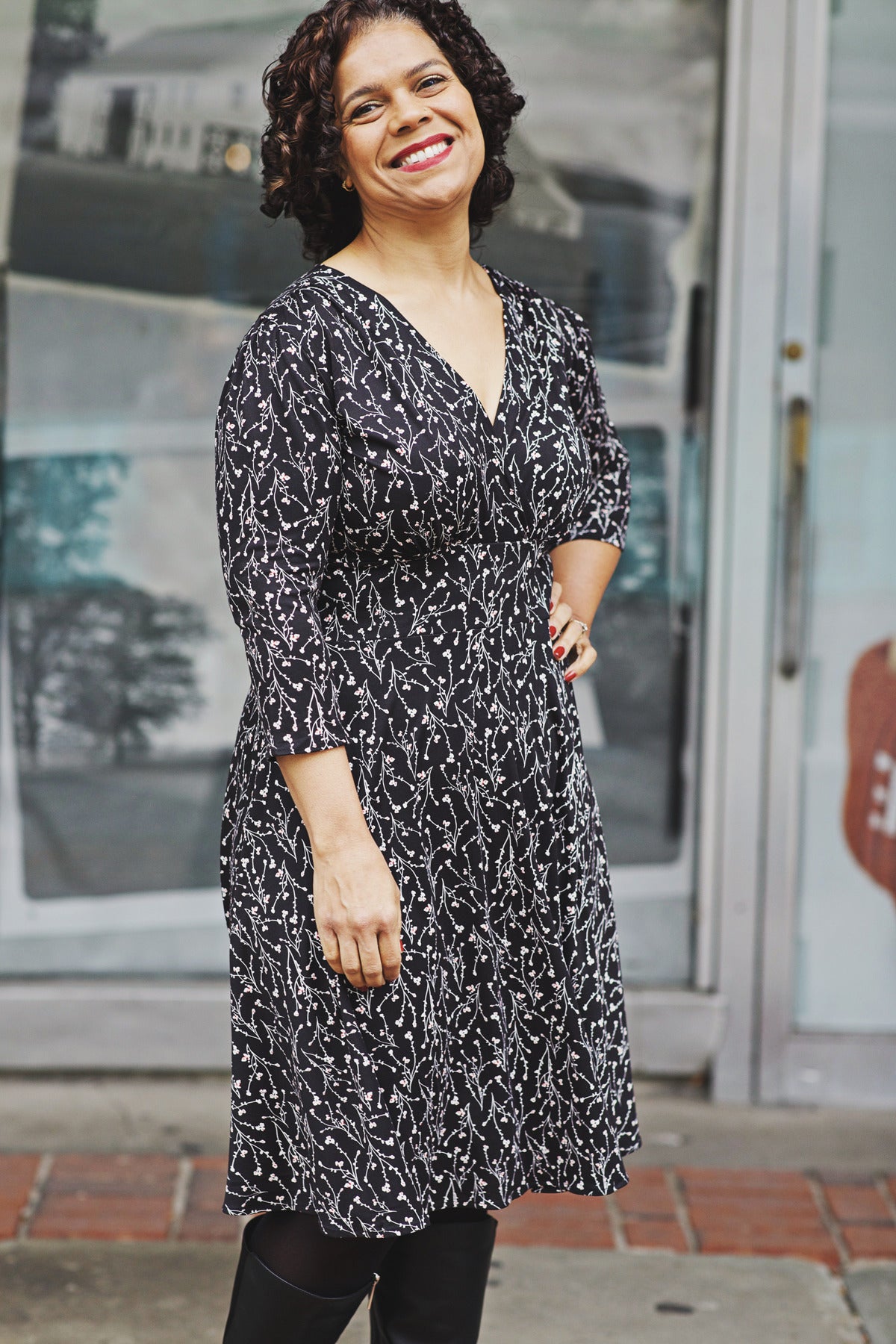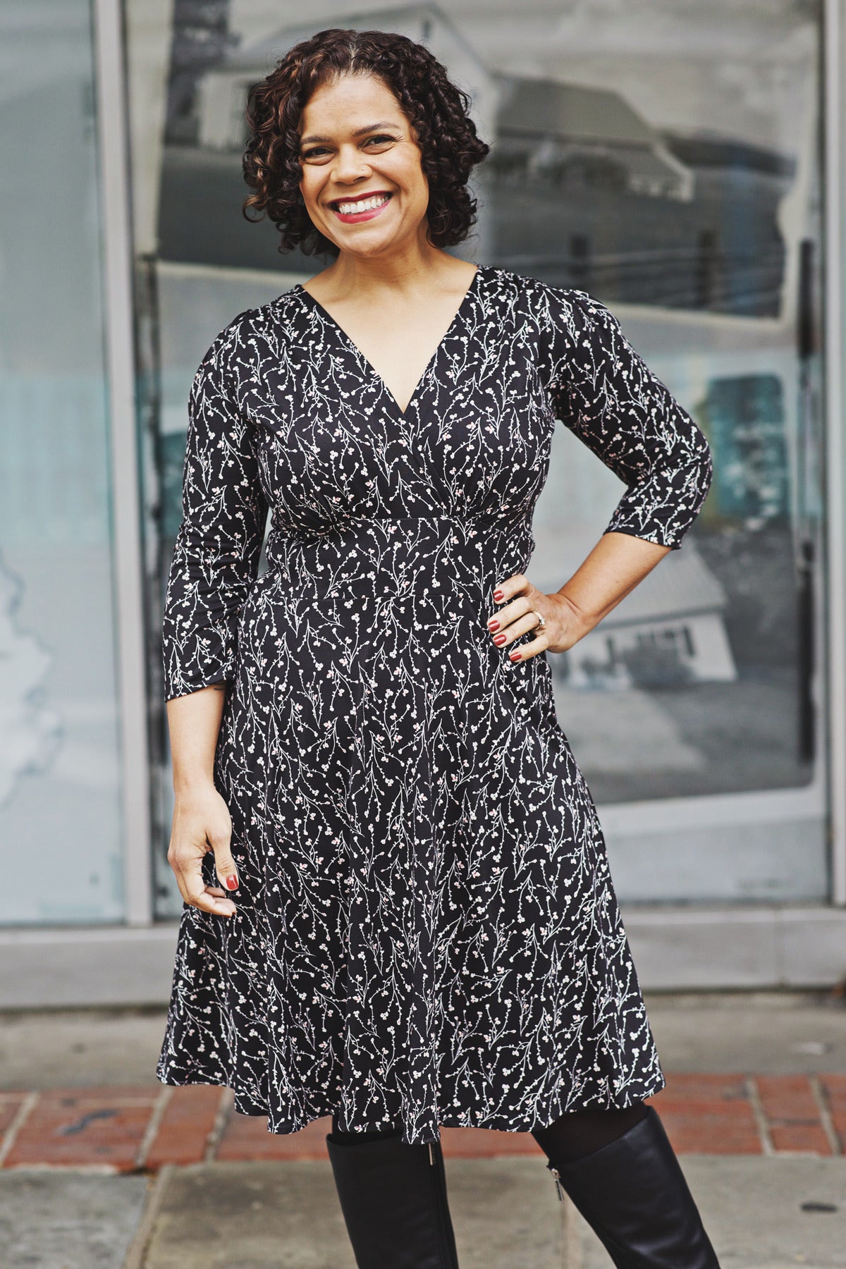 Transform any outing into an event with this must-have 3/4 sleeve beauty, boasting a cross-over V neck, waistband below the bust, and a knee-length, full skirt that's wrinkle-proof and machine washable. Feeling good starts with looking good; proudly made in the U.S.A.!