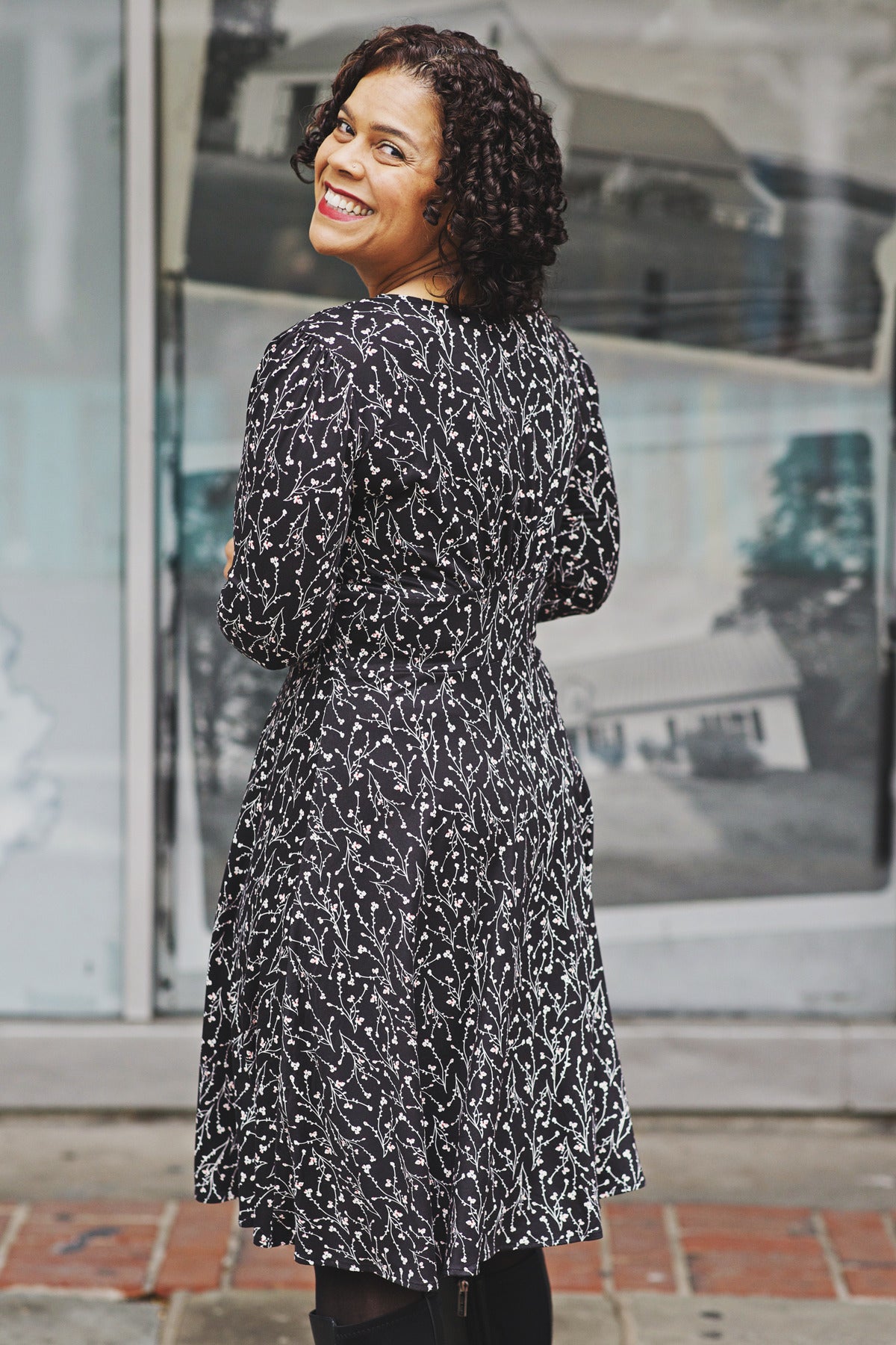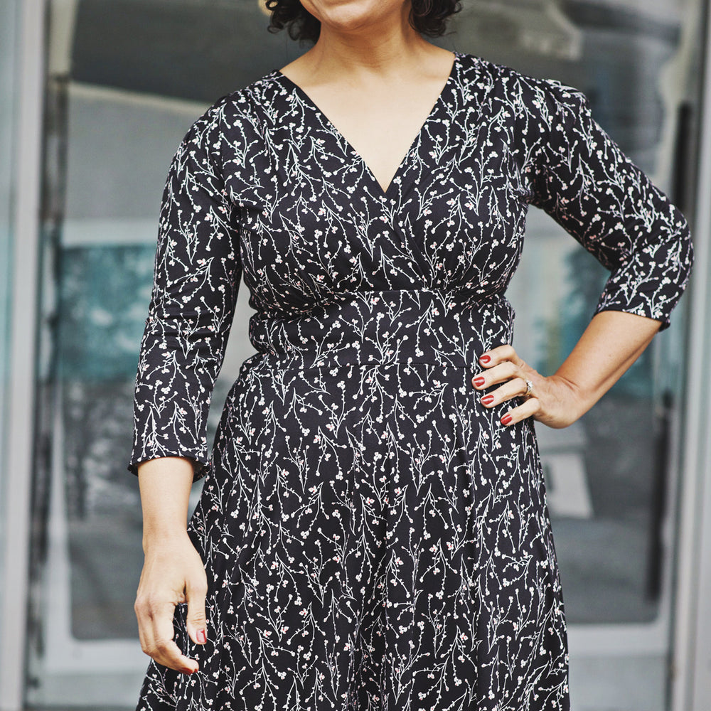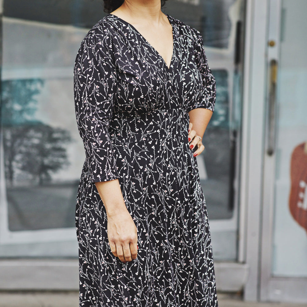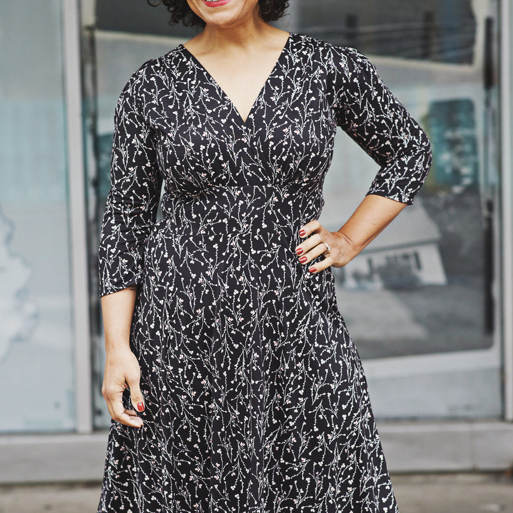 Transform any outing into an event with this must-have 3/4 sleeve beauty, boasting a cross-over V neck, waistband below the bust, and a knee-length, full skirt that's wrinkle-proof and machine washable. Feeling good starts with looking good; proudly made in the U.S.A.!