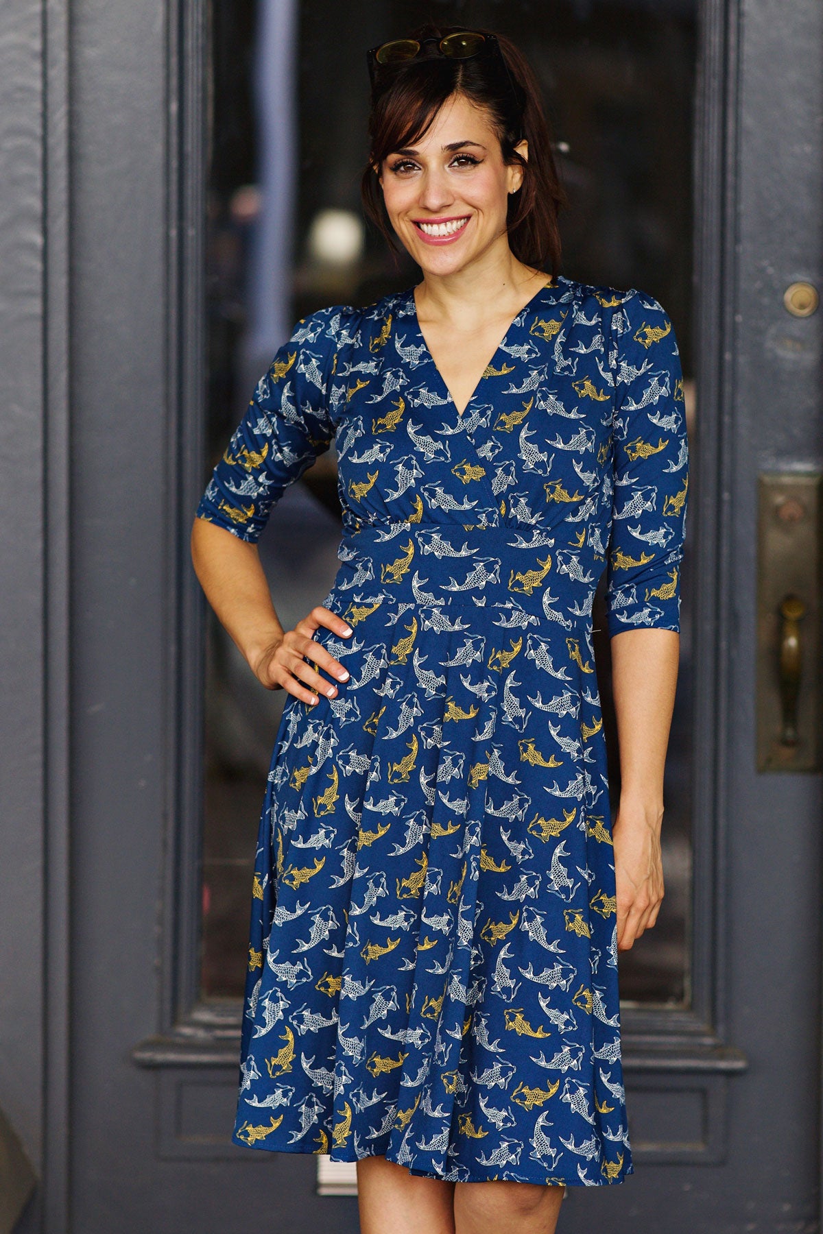 Transform any outing into an event with this must-have 3/4 sleeve beauty, boasting a cross-over V neck, waistband below the bust, and a knee-length, full skirt that's wrinkle-proof and machine washable. Feeling good starts with looking good; proudly made in the U.S.A.!