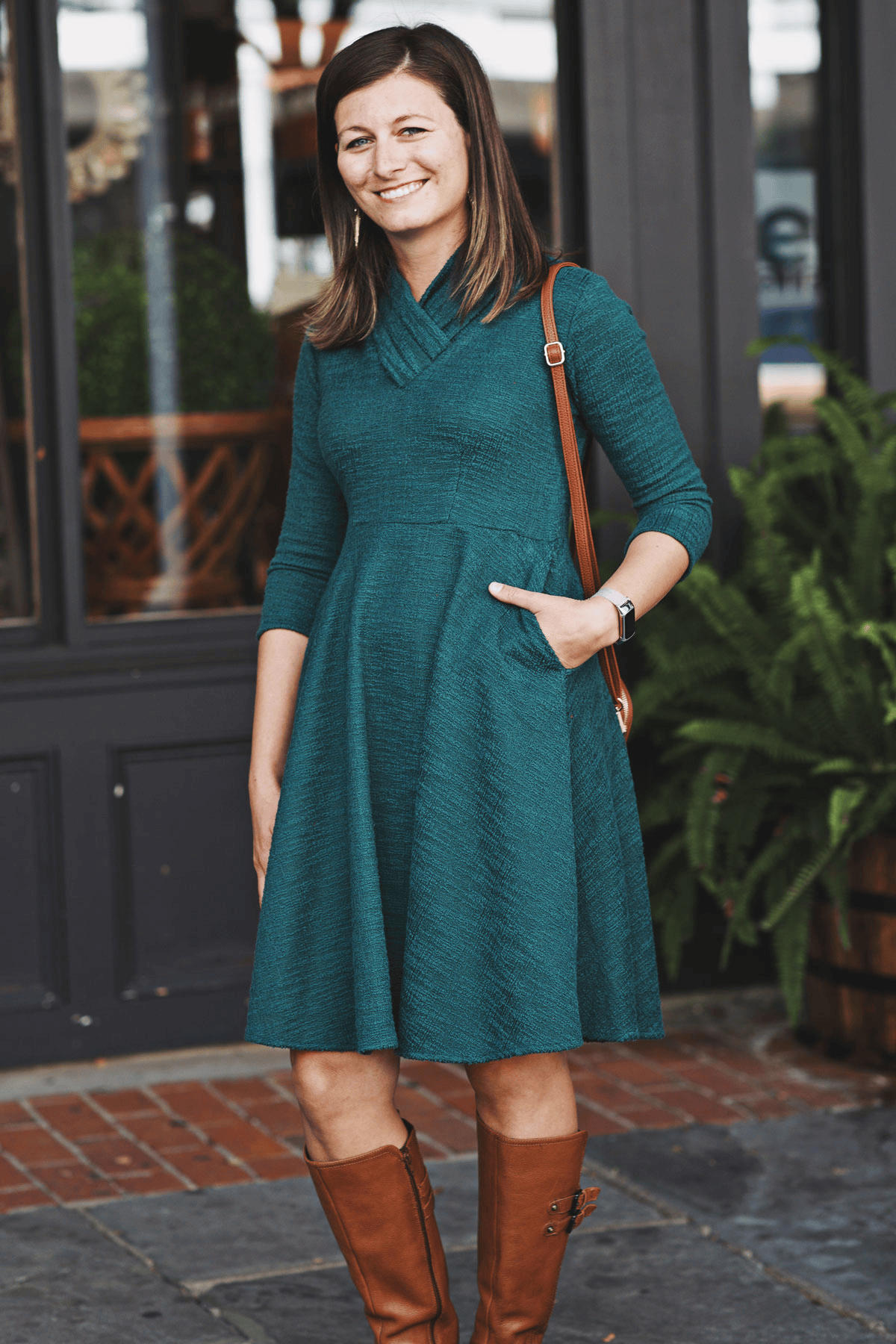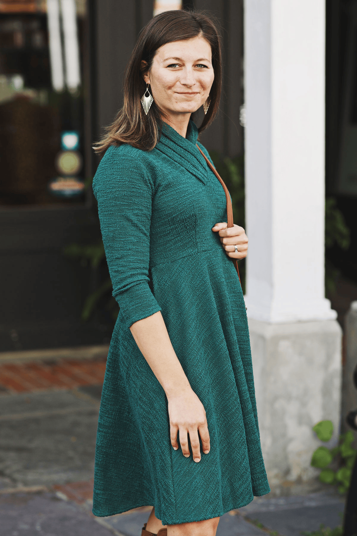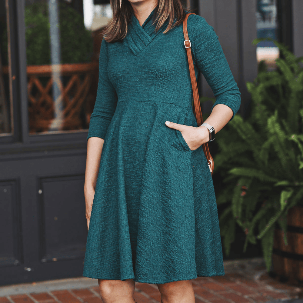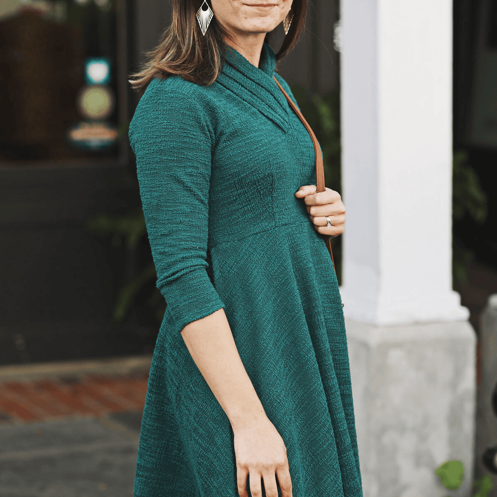 You won't find a cozier Karina Dress than this! The shape is very simple but the details are what makes this a special piece for fall and winter. The standout feature is the pleated collar. The folds in the pleats create a flattering unique sculptured look all while providing warmth and coverage for the cooler months. Two darts at the waistline provide shape and the knee length skirt features two in-seam pockets for convenience. Made from a hunter green boucle fabric, this dress is machine washable, wrinkle-free and made with love in the U.S.A.