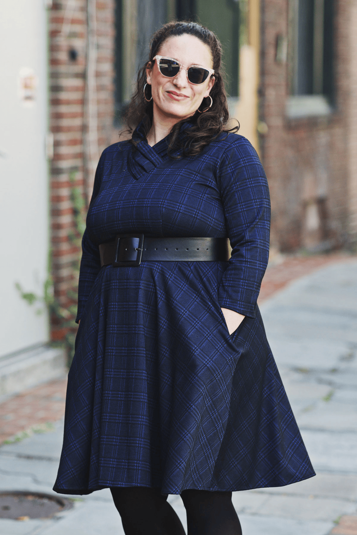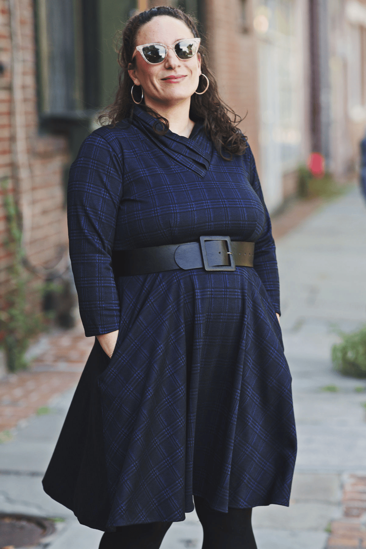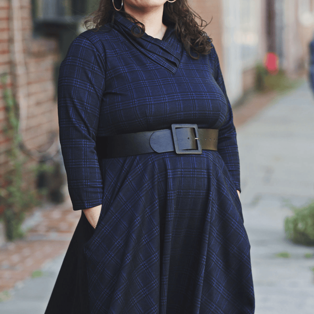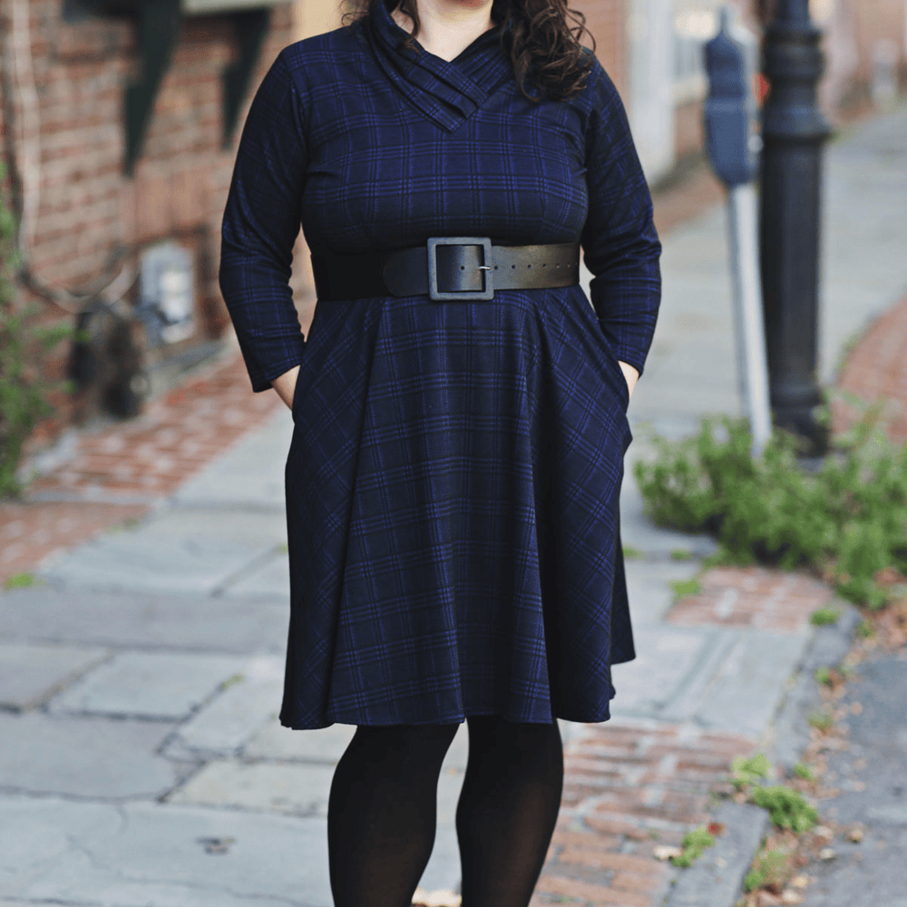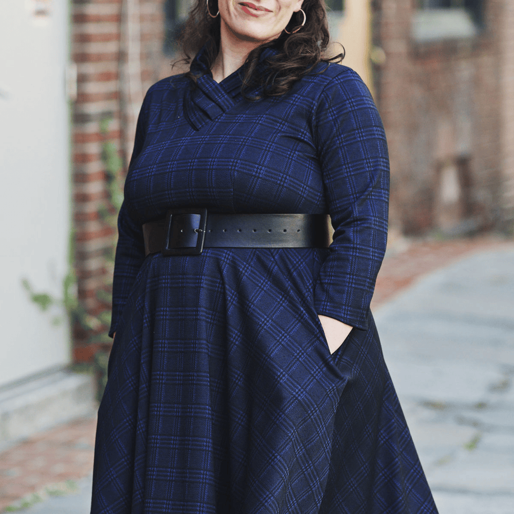 You won't find a cozier Karina Dress than this! The shape is very simple but the details are what makes this a special piece for fall and winter. The standout feature is the pleated collar. The folds in the pleats create a flattering unique sculptured look all while providing warmth and coverage for the cooler months. Two darts at the waistline provide shape and the knee length skirt features two in-seam pockets for convenience. Made from a navy and black stretch woven plaid fabric, this dress is machine washable, wrinkle-free and made with love in the U.S.A.