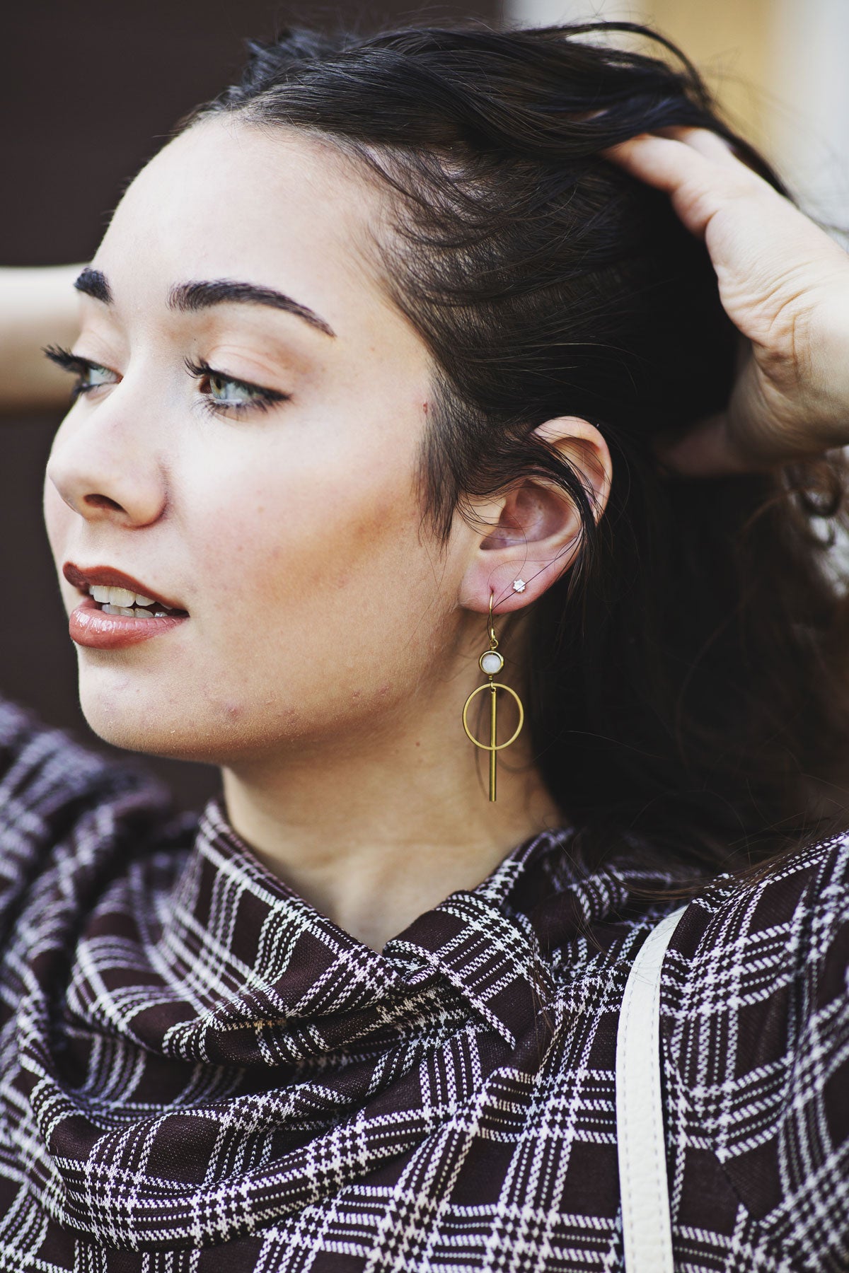 A little lunar magic, no woo required. These earrings feature natural moonstone paired with raw brass—a sleek hoop and rod combo that hits that sweet spot between earthy and architectural. Earrings feature a natural moonstone with brass hoop and rod.